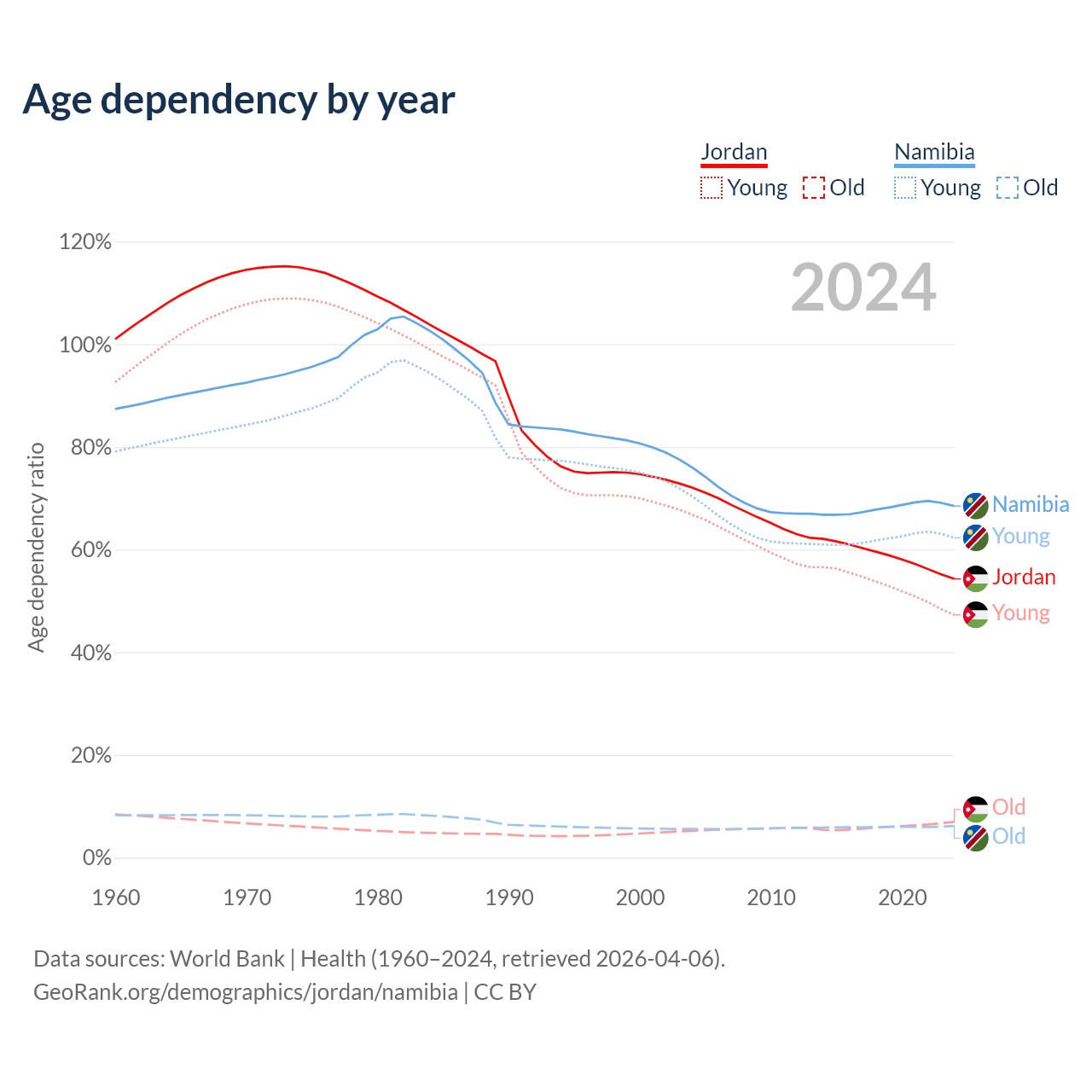 Data sources: World Bank | Health (1960–2024, retrieved 2026-04-06); U.S. Census Bureau (1960–2024, retrieved 2026-02-08).