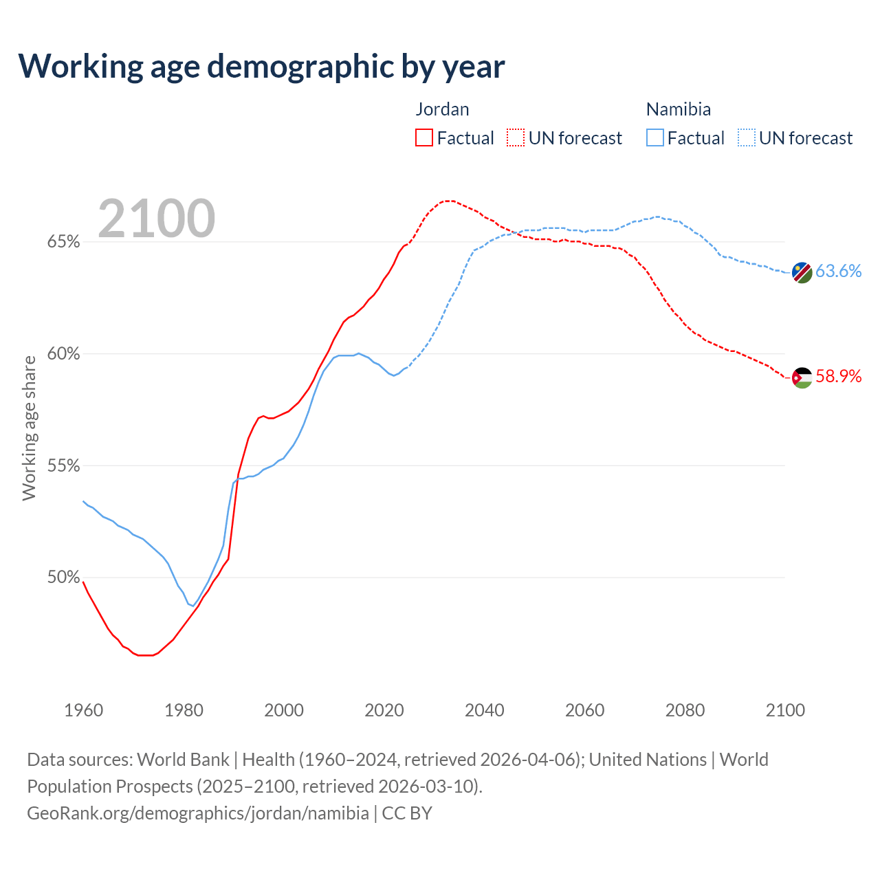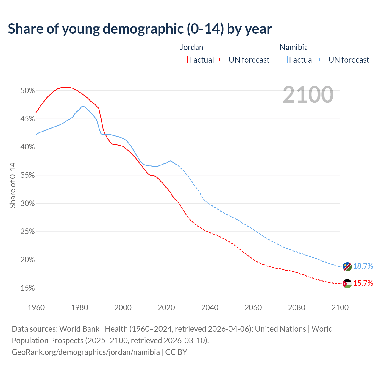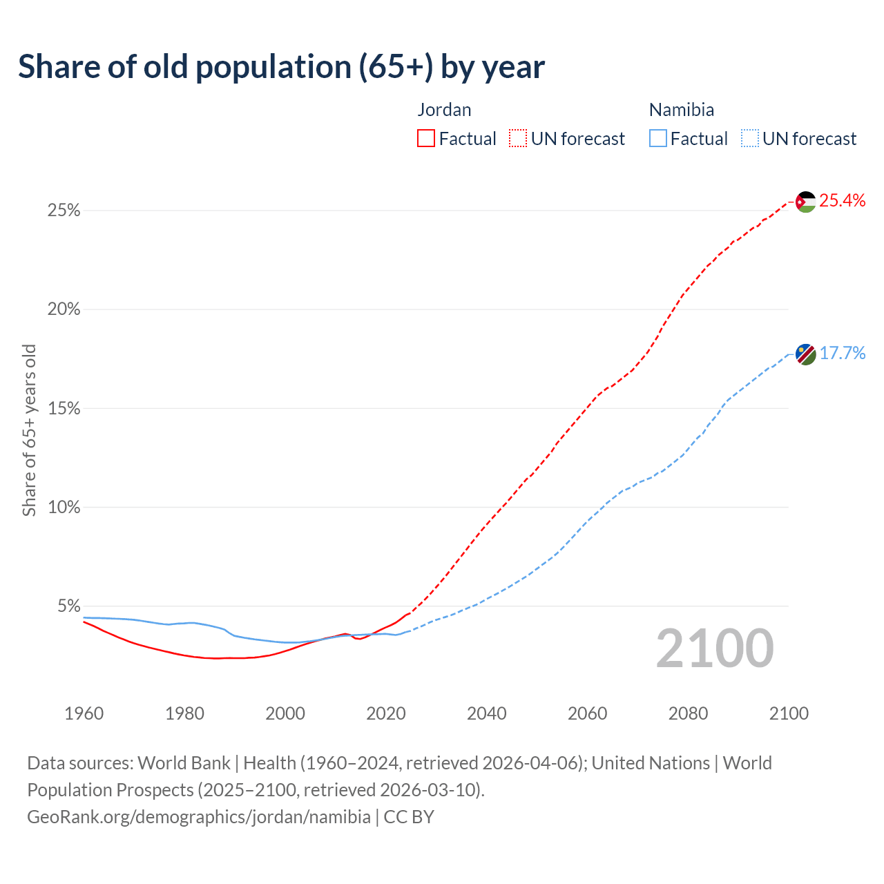 Median age Jordan vs Namibia, 1960-2100