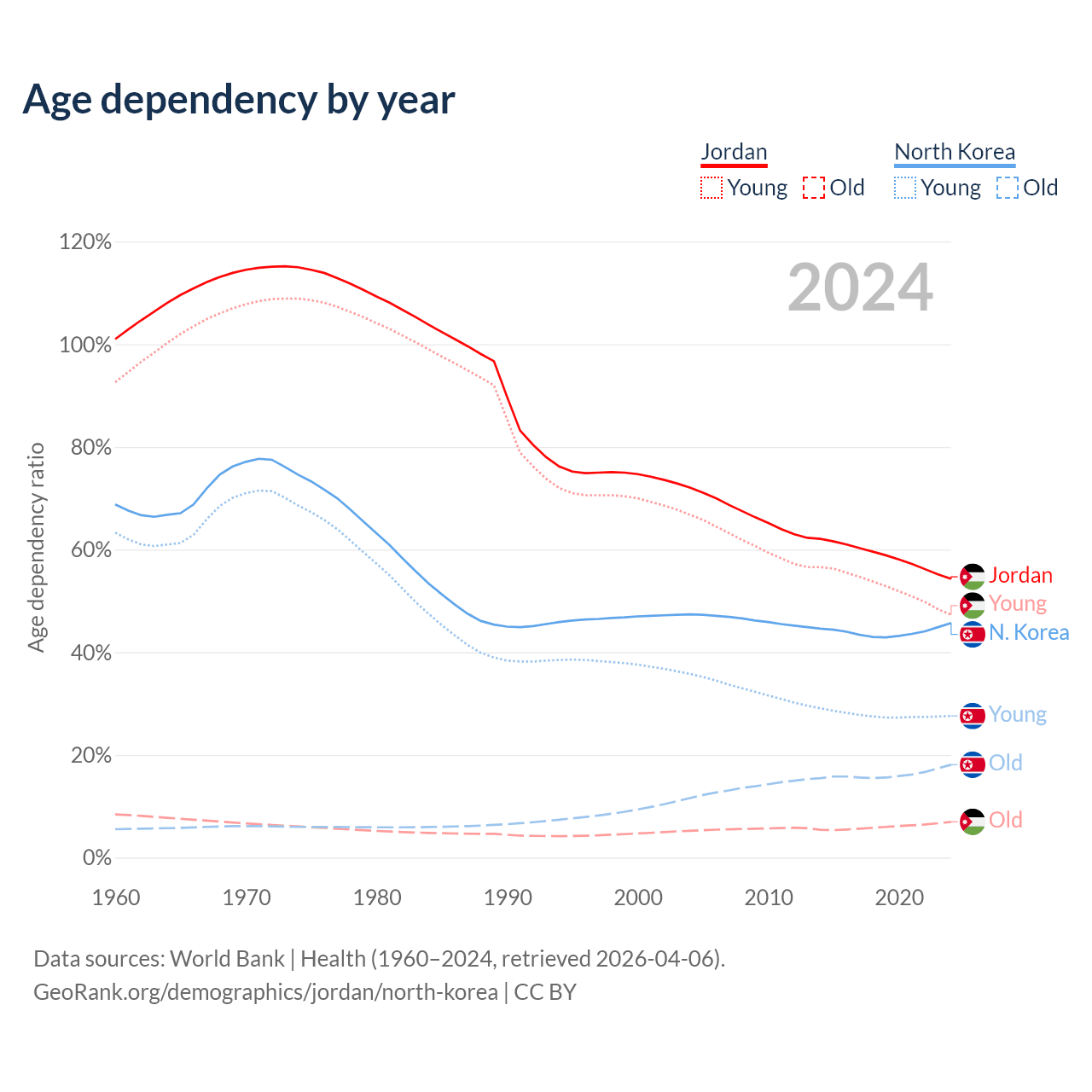 - The share of old-age demographic (65+) in Jordan is 4.52% vs 12.4% in North Korea.