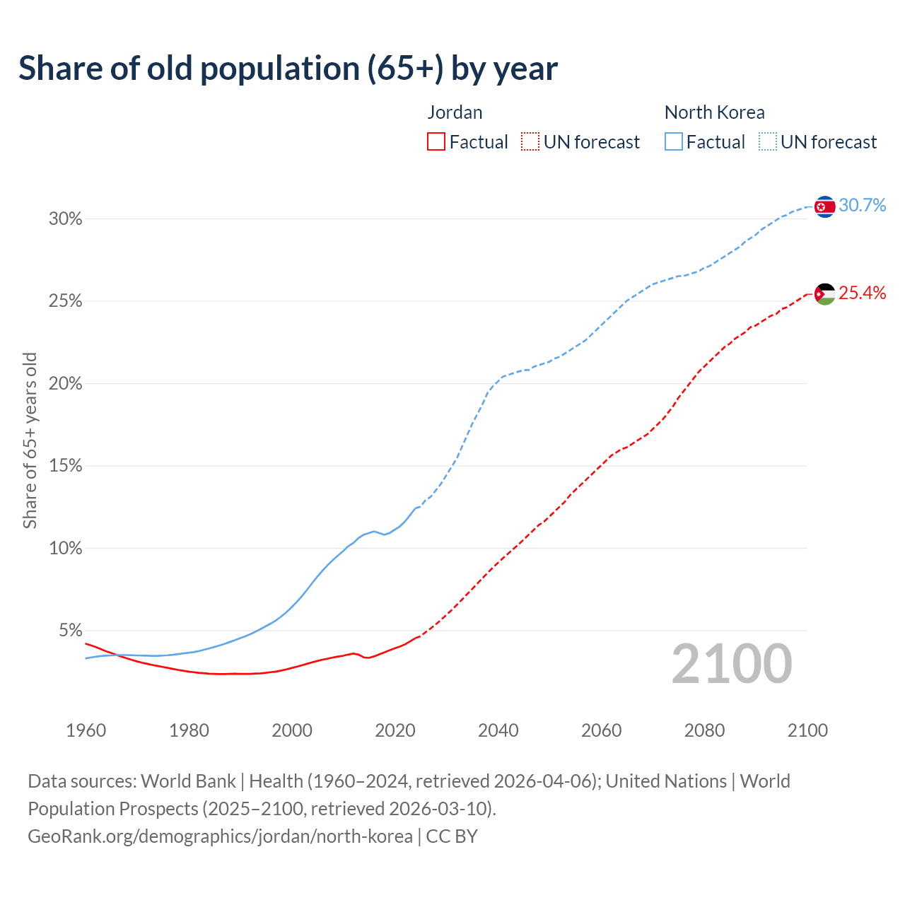 The share of older people aged 65 and over is 4.52% in Jordan and 12.4% in North Korea. Life expectancy in Jordan compared to North Korea .