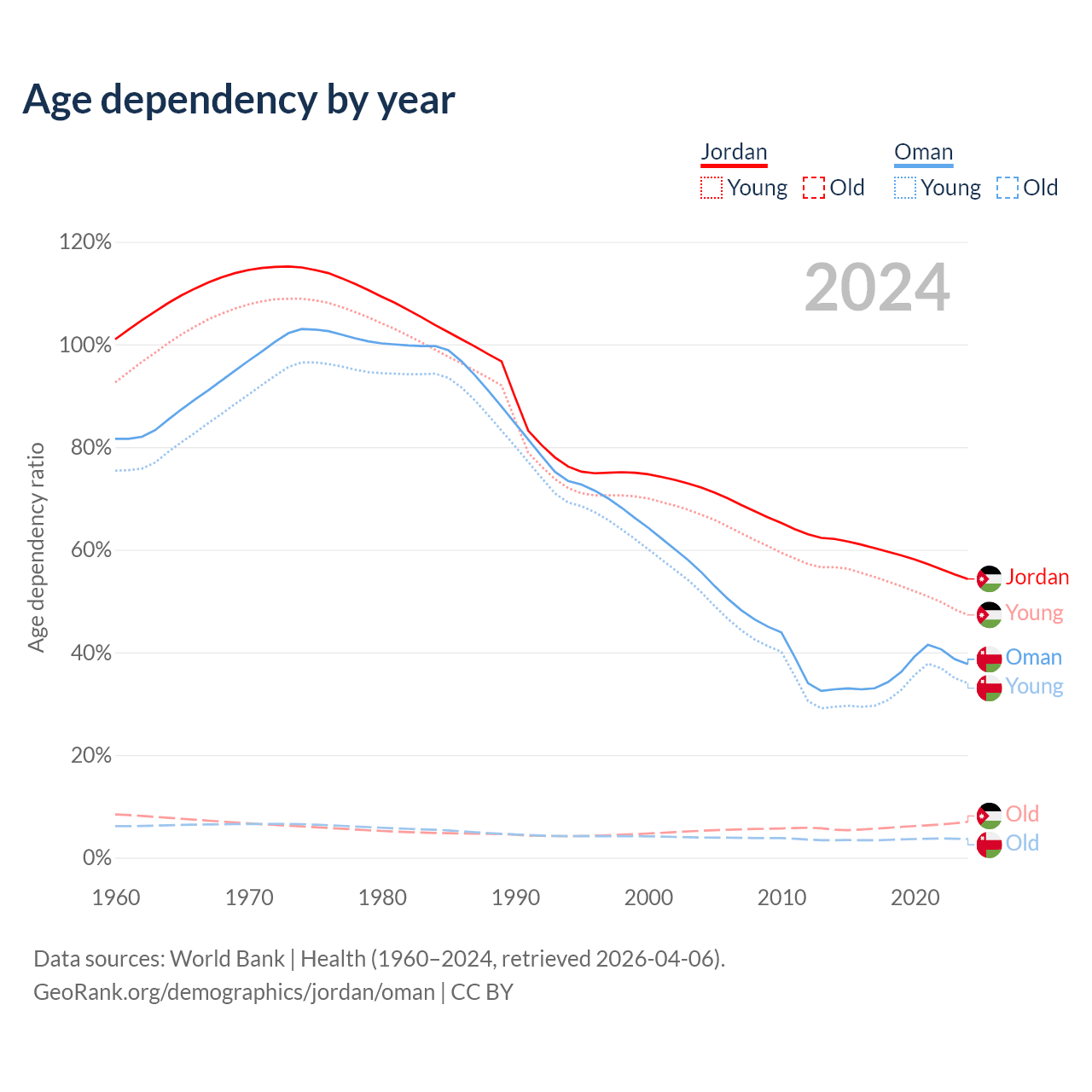 Data sources: World Bank | Health (1960–2024, retrieved 2026-04-06); U.S. Census Bureau (1960–2024, retrieved 2026-02-08).