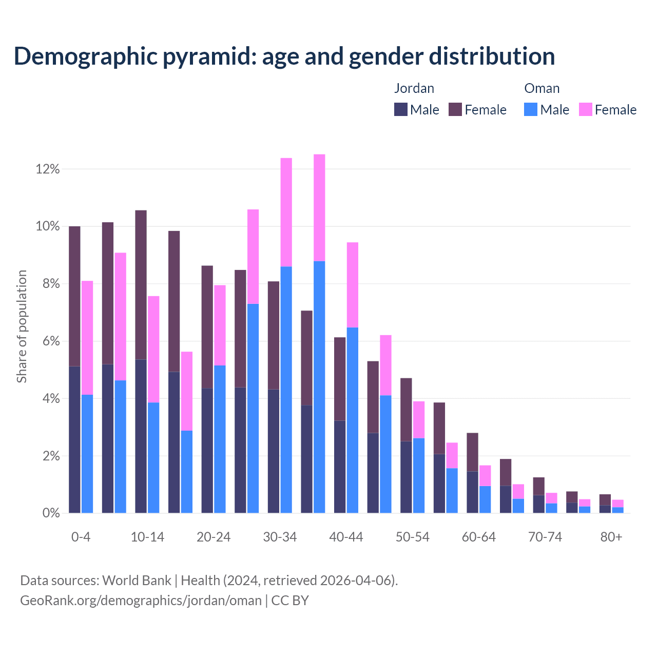 - Jordan is ranked 131/196 by median age (oldest to youngest) vs 101/196 for Oman.