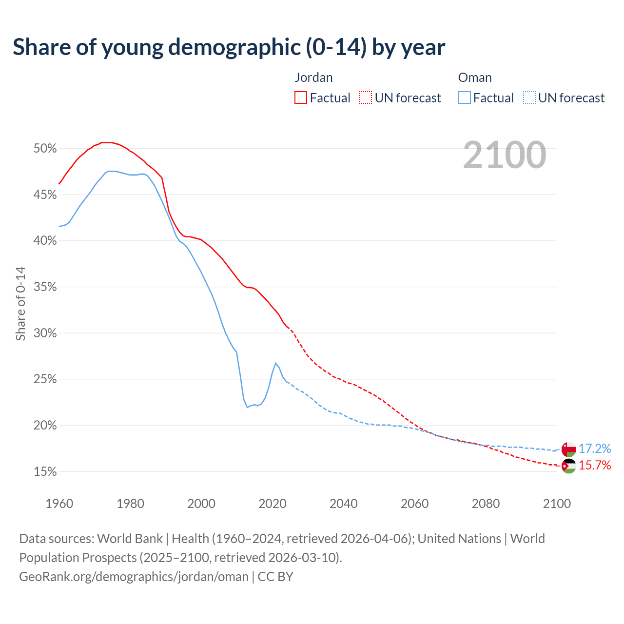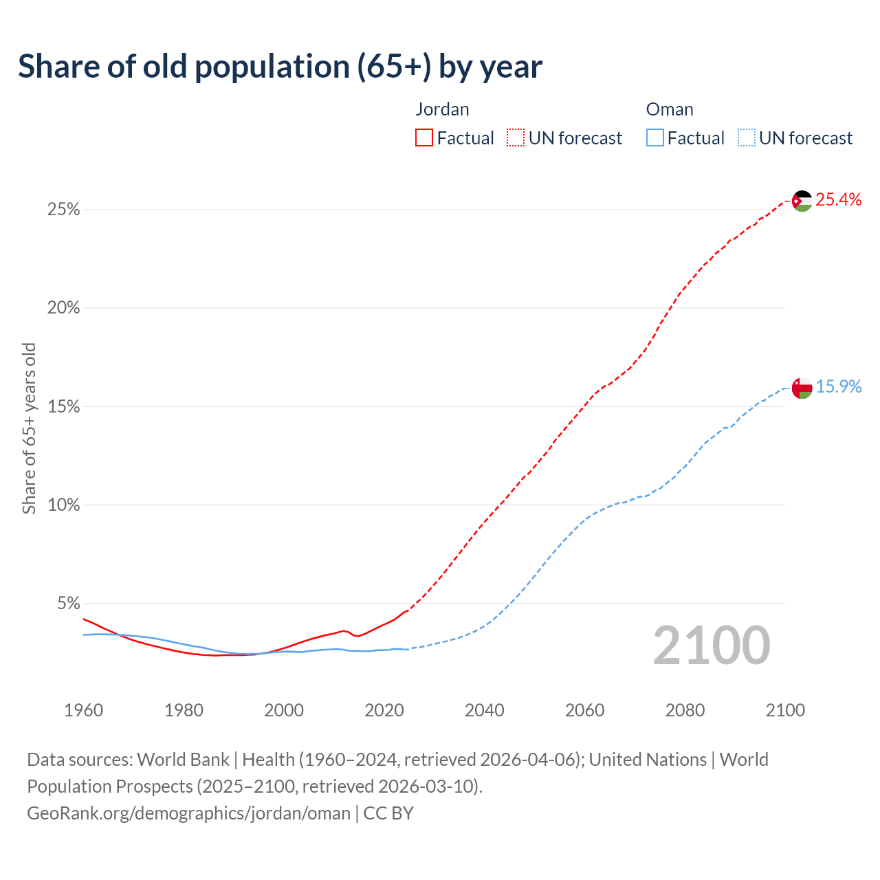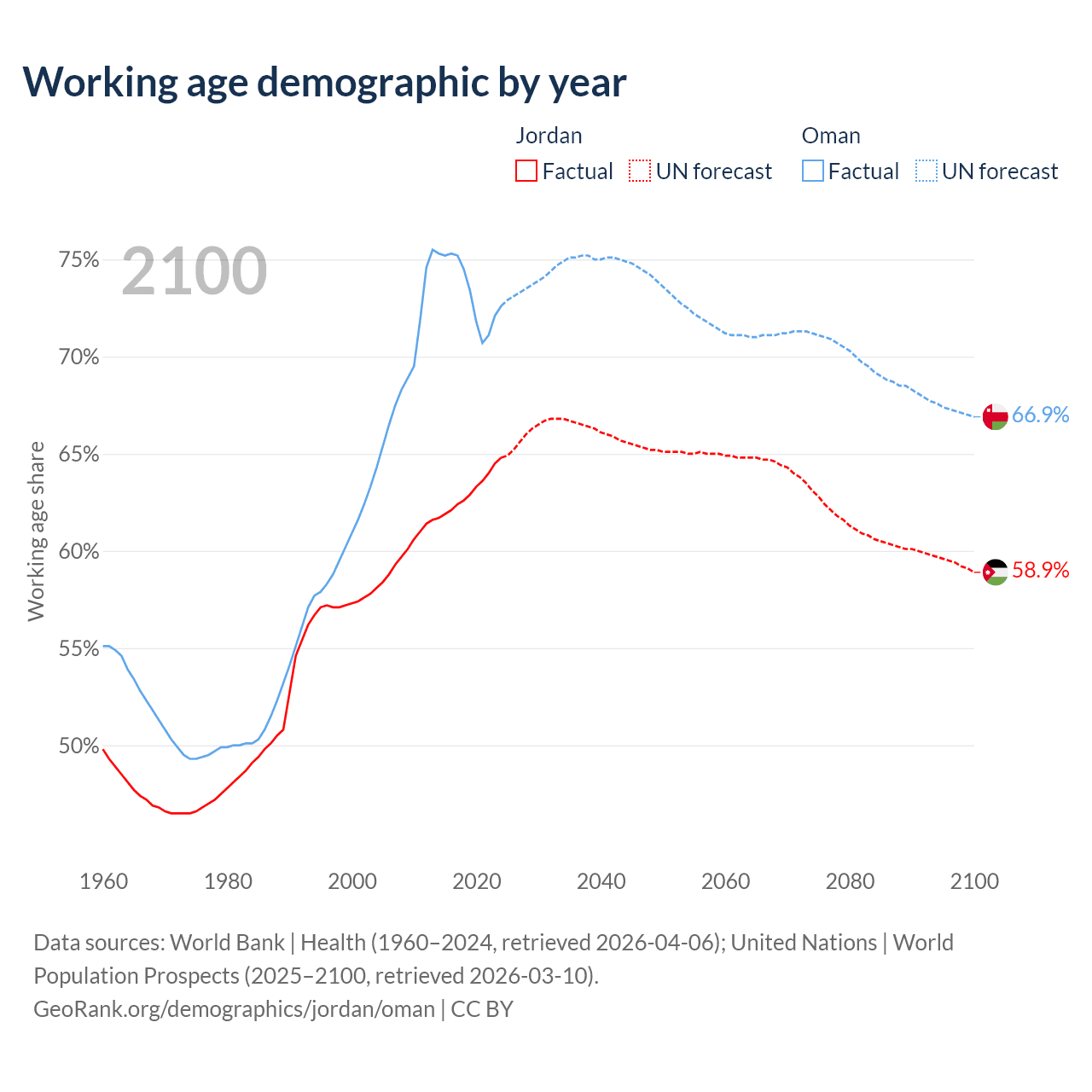 Median age Jordan vs Oman, 1960-2100