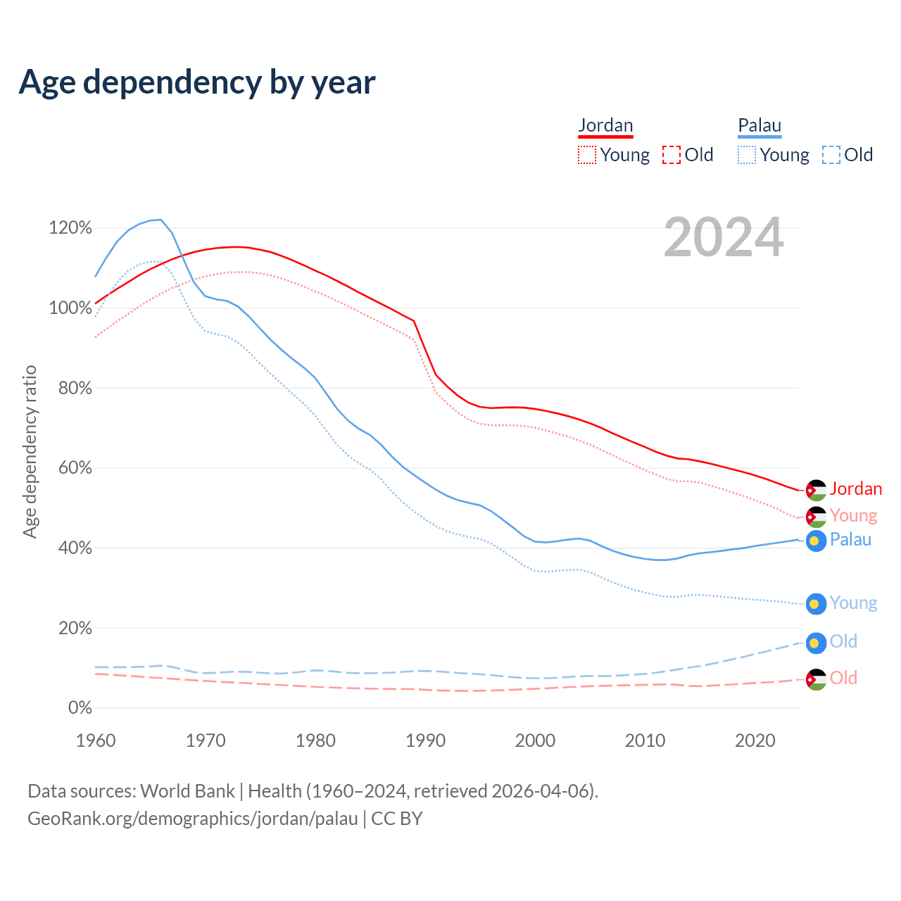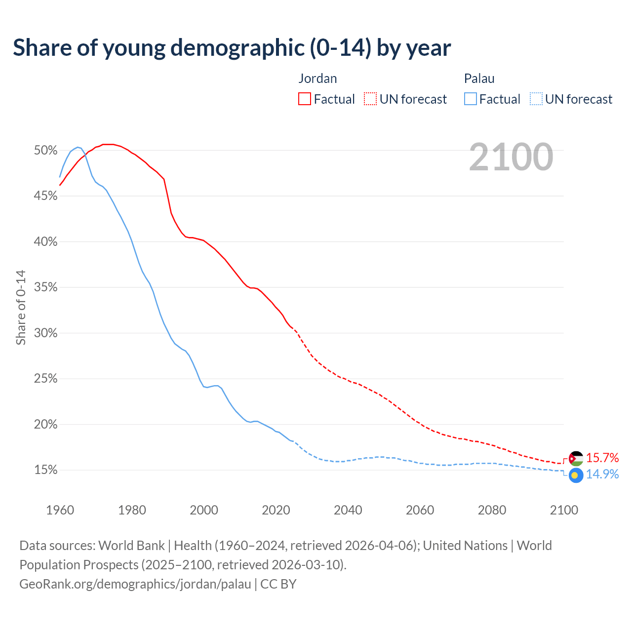 - The share of young demographic (0-15 years old) in Jordan is 30.7% vs 18.2% in Palau.