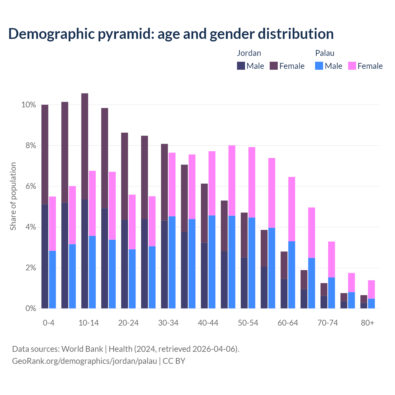 - Jordan is ranked 131/196 by median age (oldest to youngest) vs 53/196 for Palau.