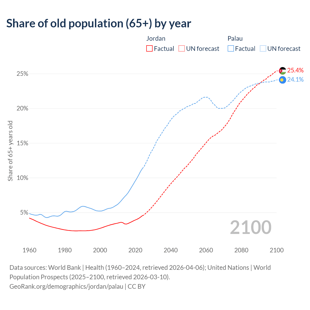 - The share of old-age demographic (65+) in Jordan is 4.52% vs 11.3% in Palau.