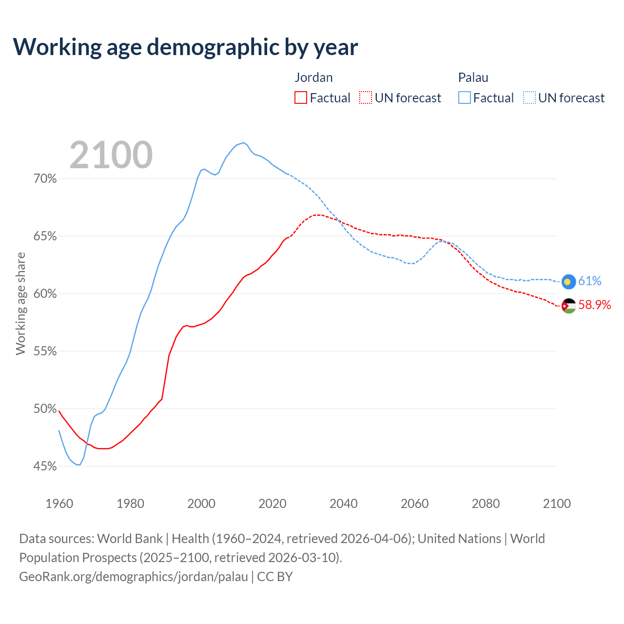 - Jordan has 7.49M working age adults (aged 15-64) vs 12.4K in Palau.