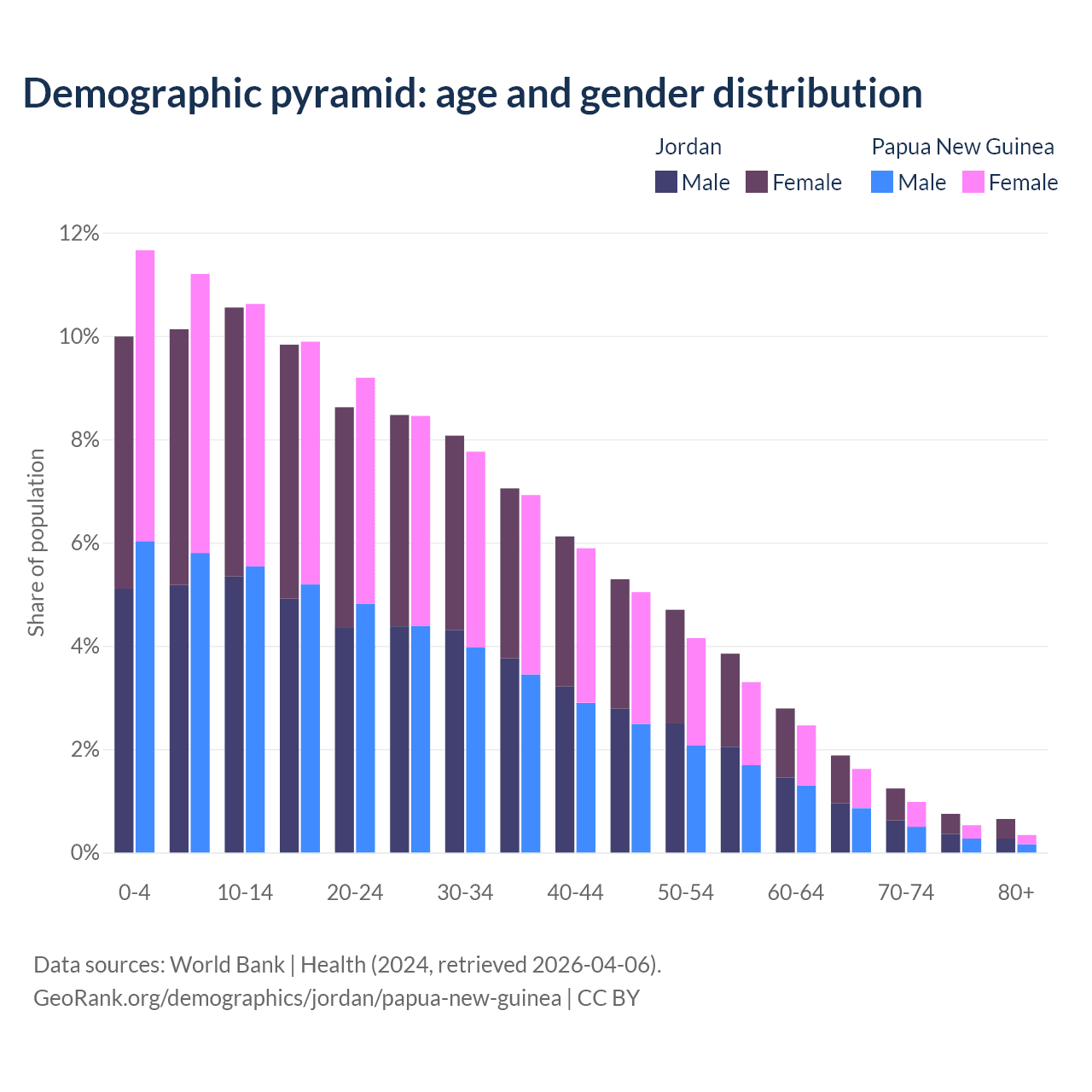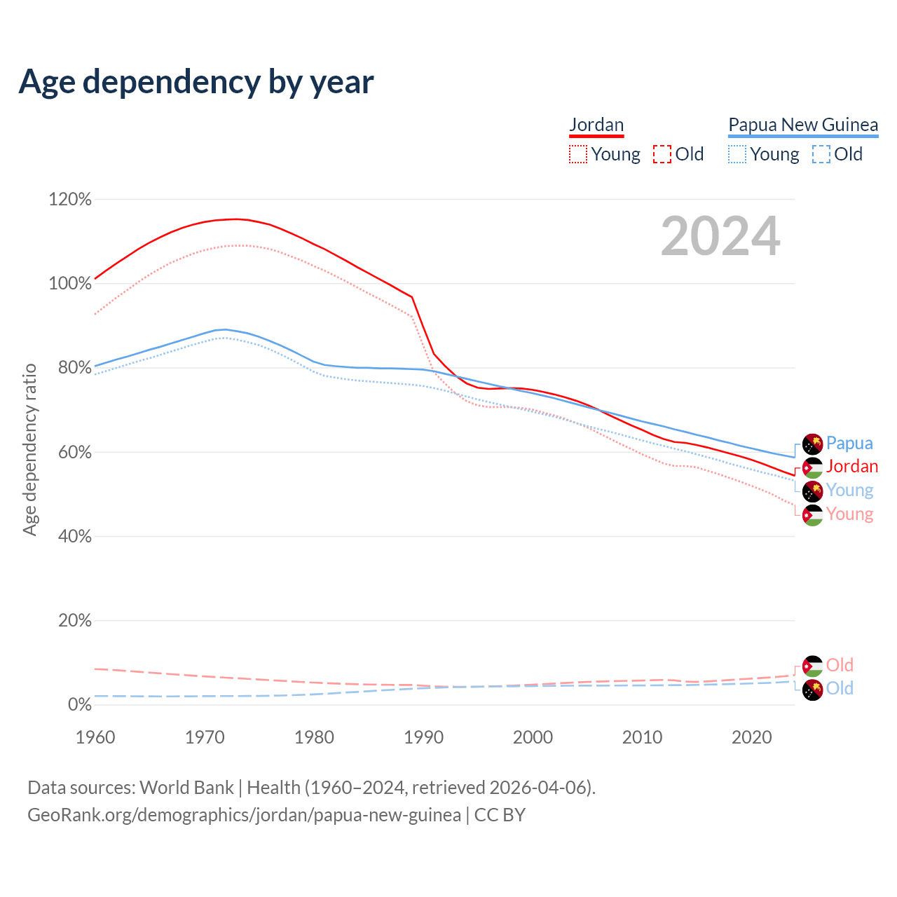 - The share of old-age demographic (65+) in Jordan is 4.52% vs 3.46% in Papua New Guinea.