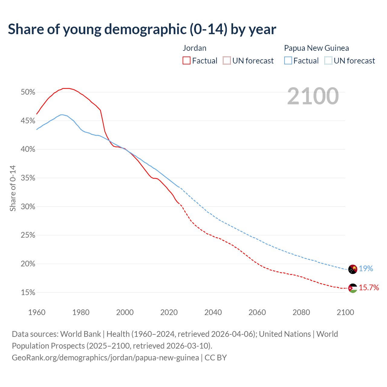 - The share of young demographic (0-15 years old) in Jordan is 30.7% vs 33.5% in Papua New Guinea.