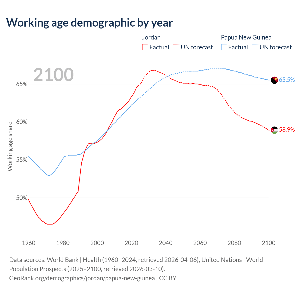 Median age Jordan vs Papua New Guinea, 1960-2100