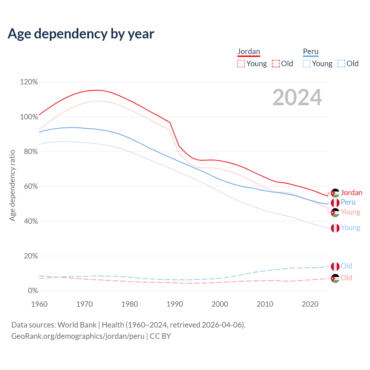 - Jordan is ranked 131/196 by median age (oldest to youngest) vs 97/196 for Peru.