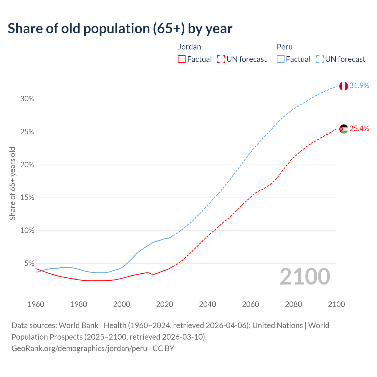 - The share of old-age demographic (65+) in Jordan is 4.52% vs 9.23% in Peru.
