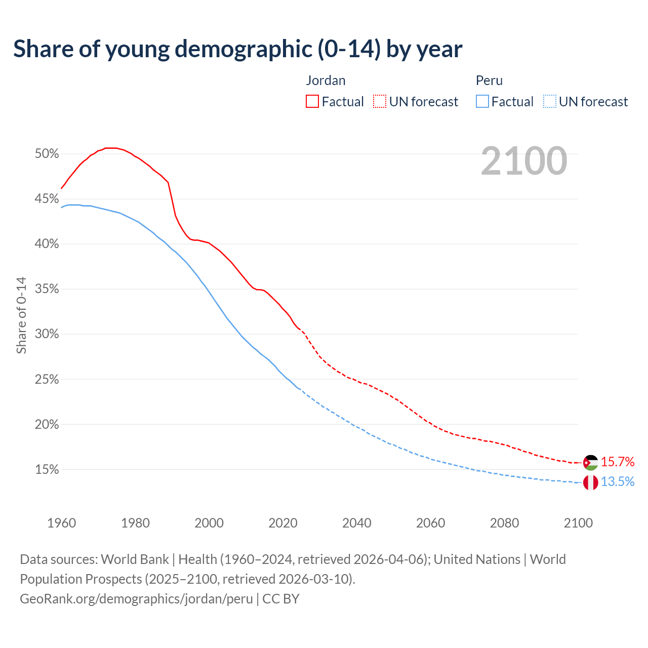 - The share of young demographic (0-15 years old) in Jordan is 30.7% vs 24% in Peru.