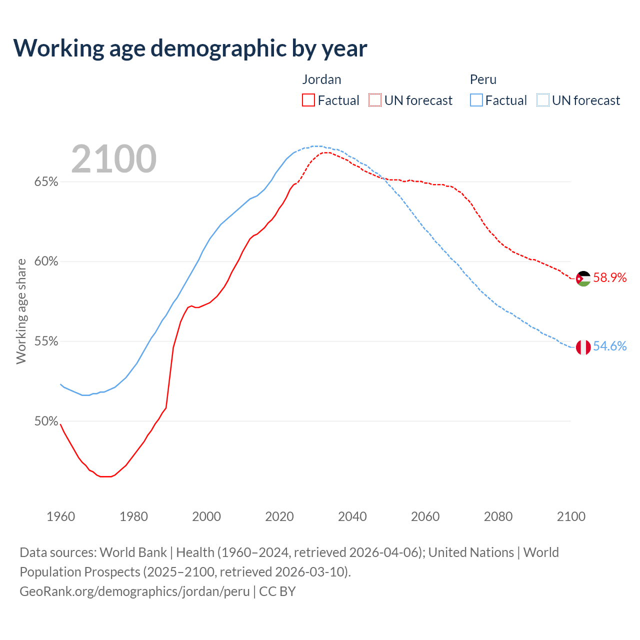 - Jordan has 7.49M working age adults (aged 15-64) vs 23.4M in Peru.