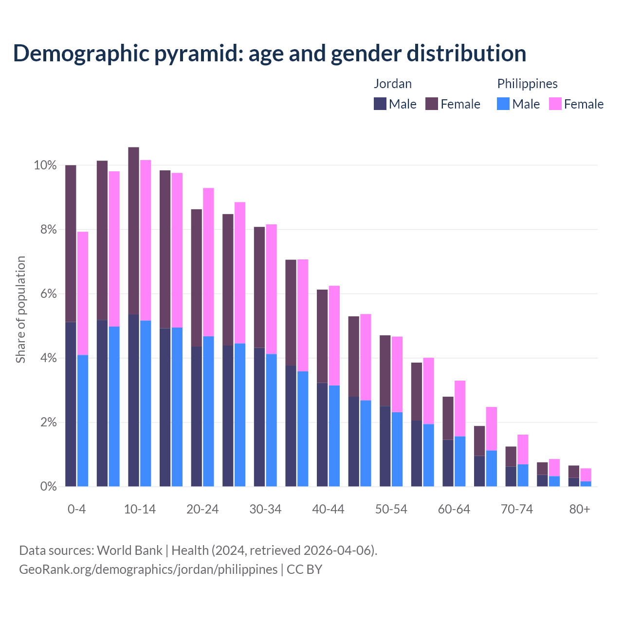- Jordan is ranked 131/196 by median age (oldest to youngest) vs 123/196 for the Philippines.
