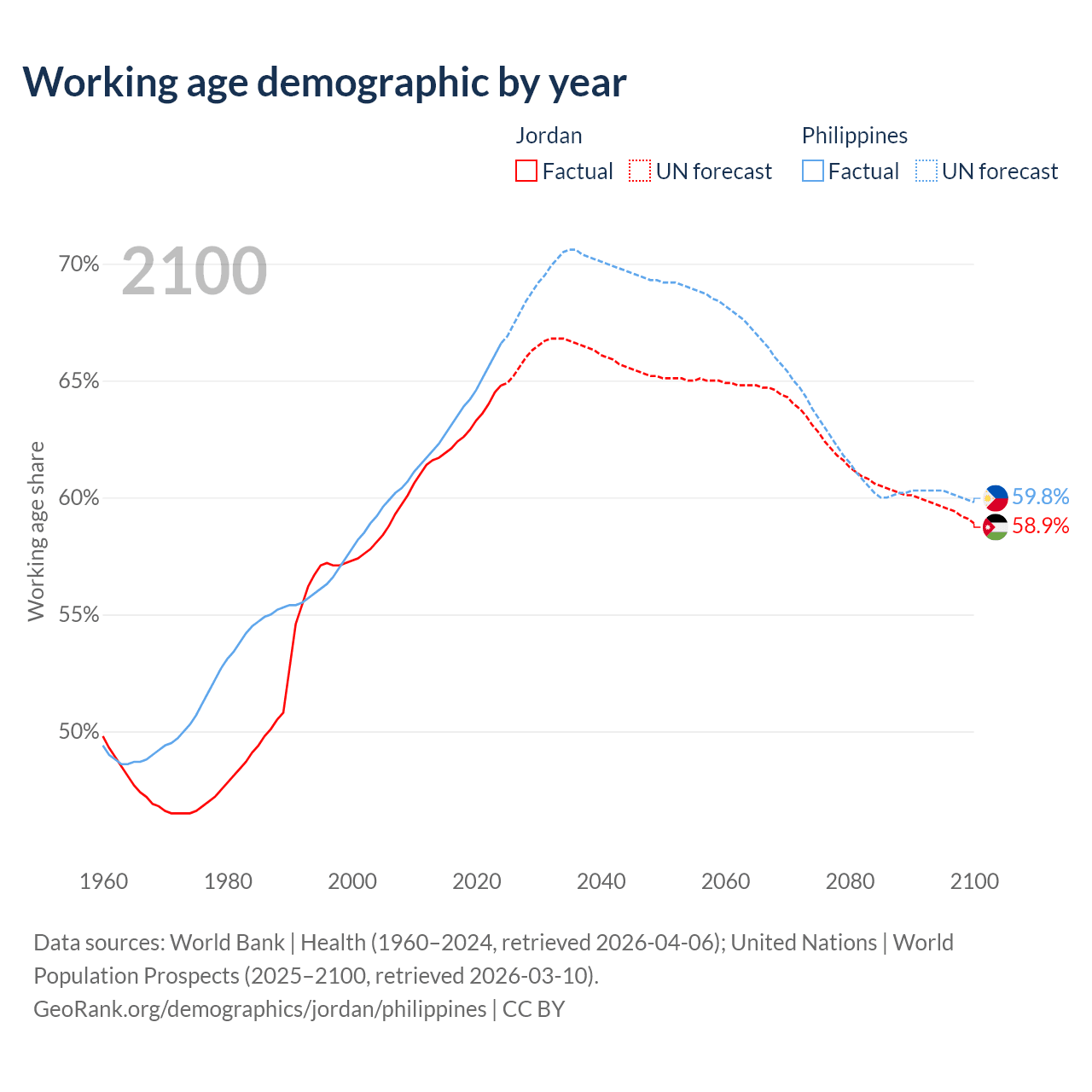 - Jordan has 7.49M working age adults (aged 15-64) vs 78.6M in the Philippines.