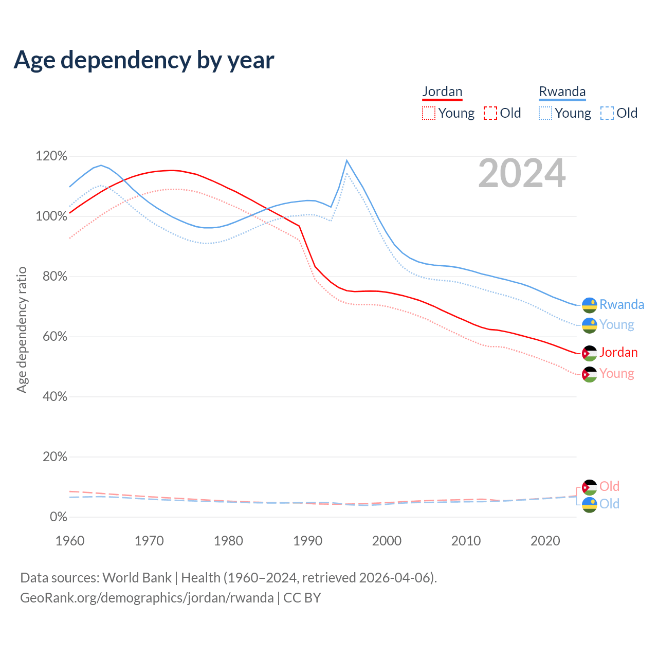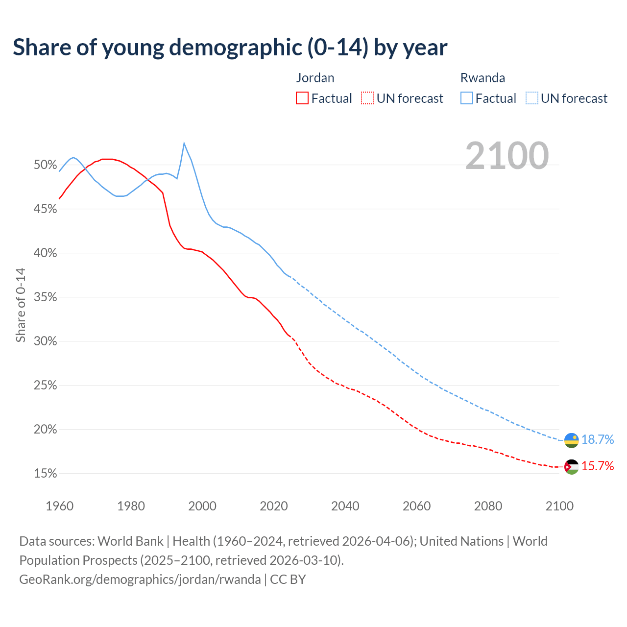 - Jordan is ranked 131/196 by median age (oldest to youngest) vs 160/196 for Rwanda.