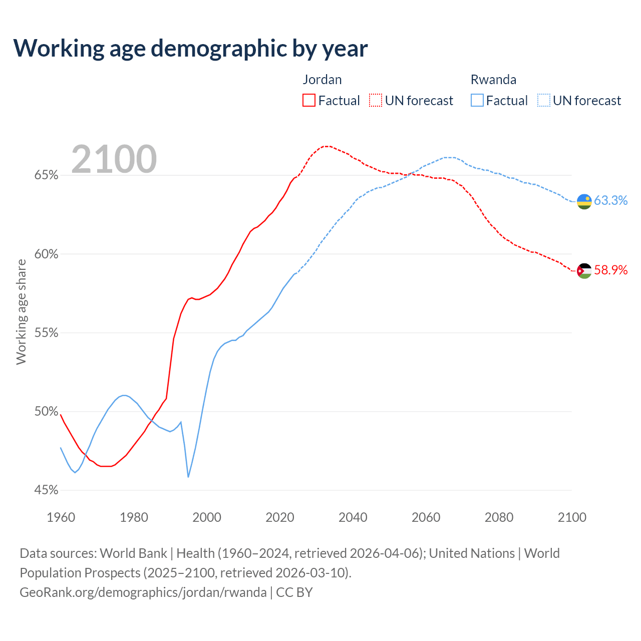 - Jordan has 7.49M working age adults (aged 15-64) vs 8.79M in Rwanda.