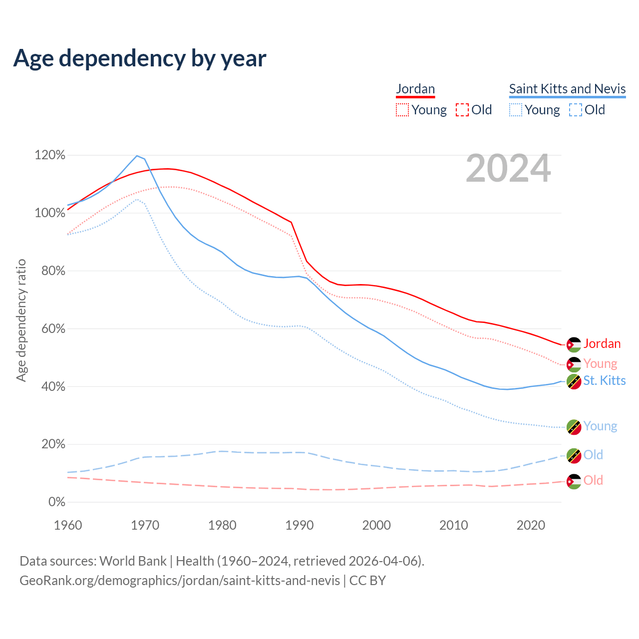 - Jordan is ranked 131/196 by median age (oldest to youngest) vs 69/196 for Saint Kitts and Nevis.