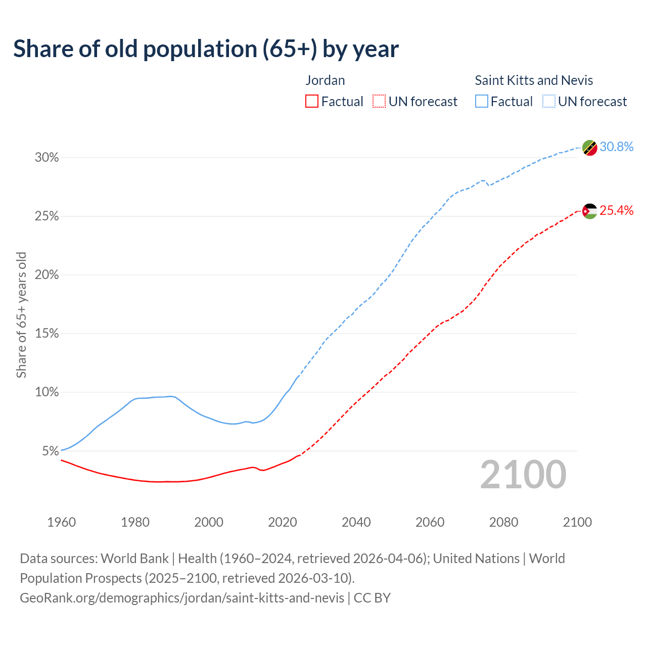 The share of older people aged 65 and over is 4.52% in Jordan and 11.2% in Saint Kitts and Nevis. Life expectancy in Jordan compared to Saint Kitts and Nevis .