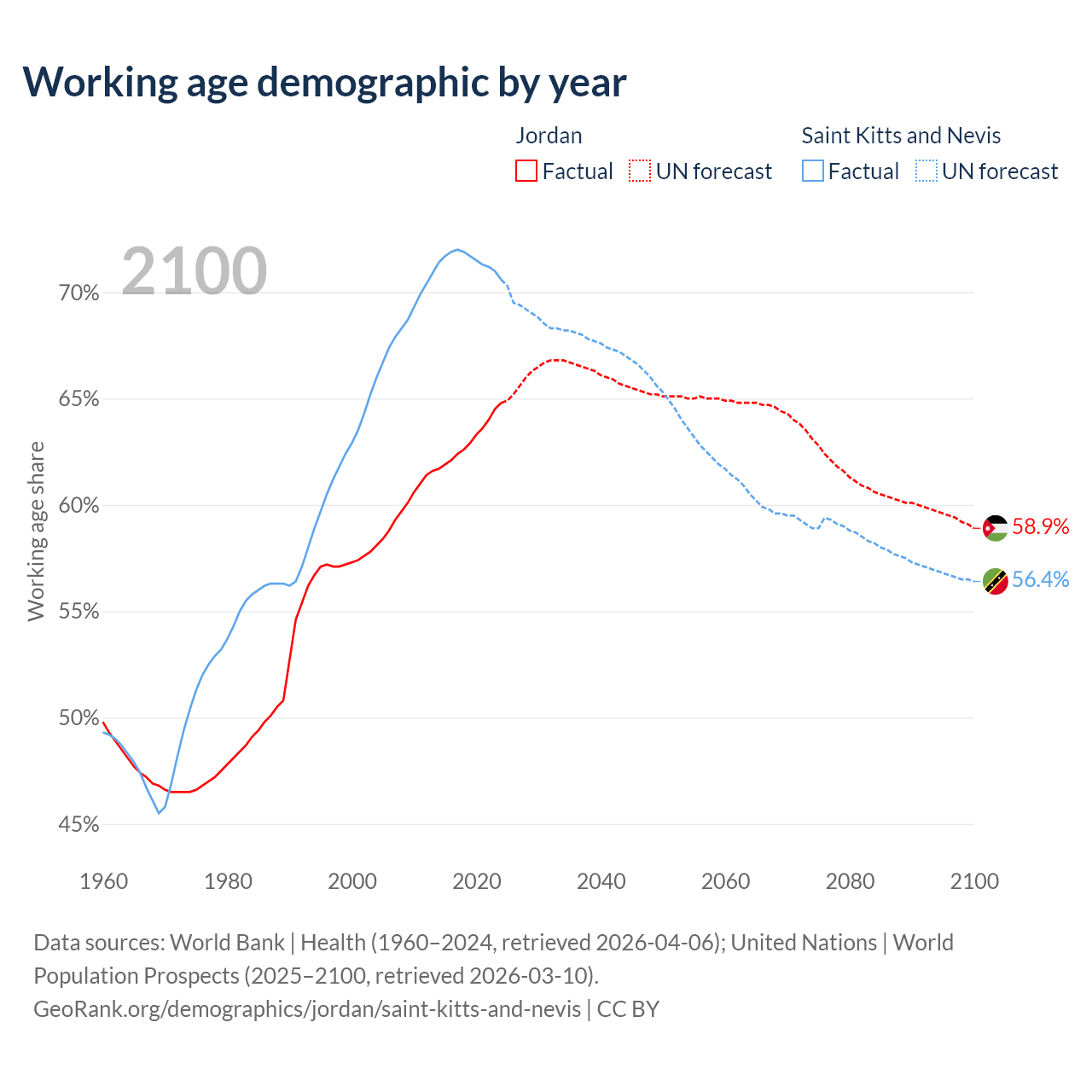- Jordan has 7.49M working age adults (aged 15-64) vs 33.2K in Saint Kitts and Nevis.