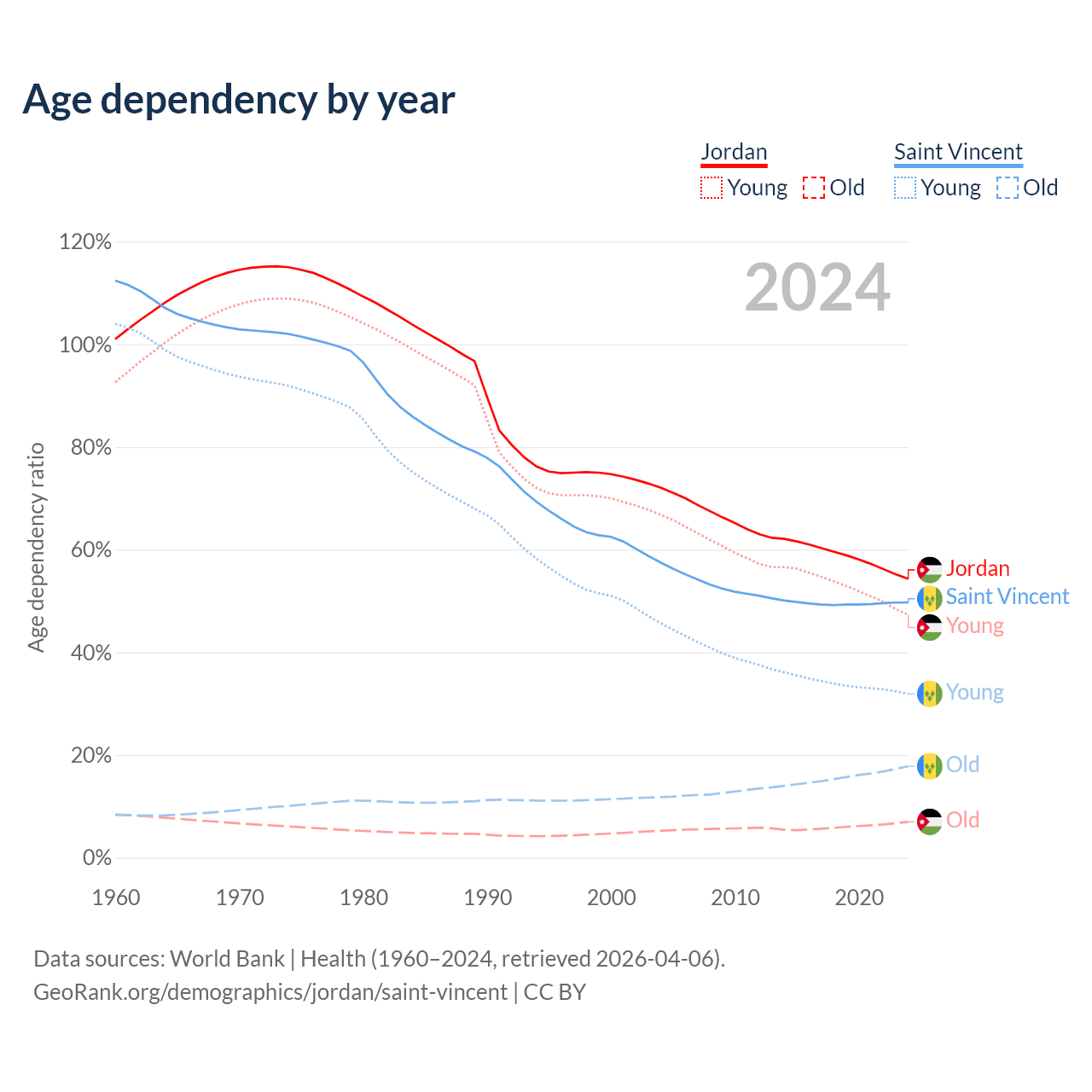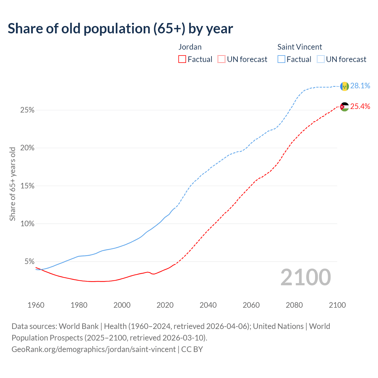 - The share of old-age demographic (65+) in Jordan is 4.52% vs 11.9% in Saint Vincent.