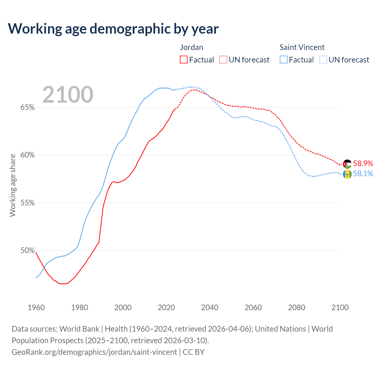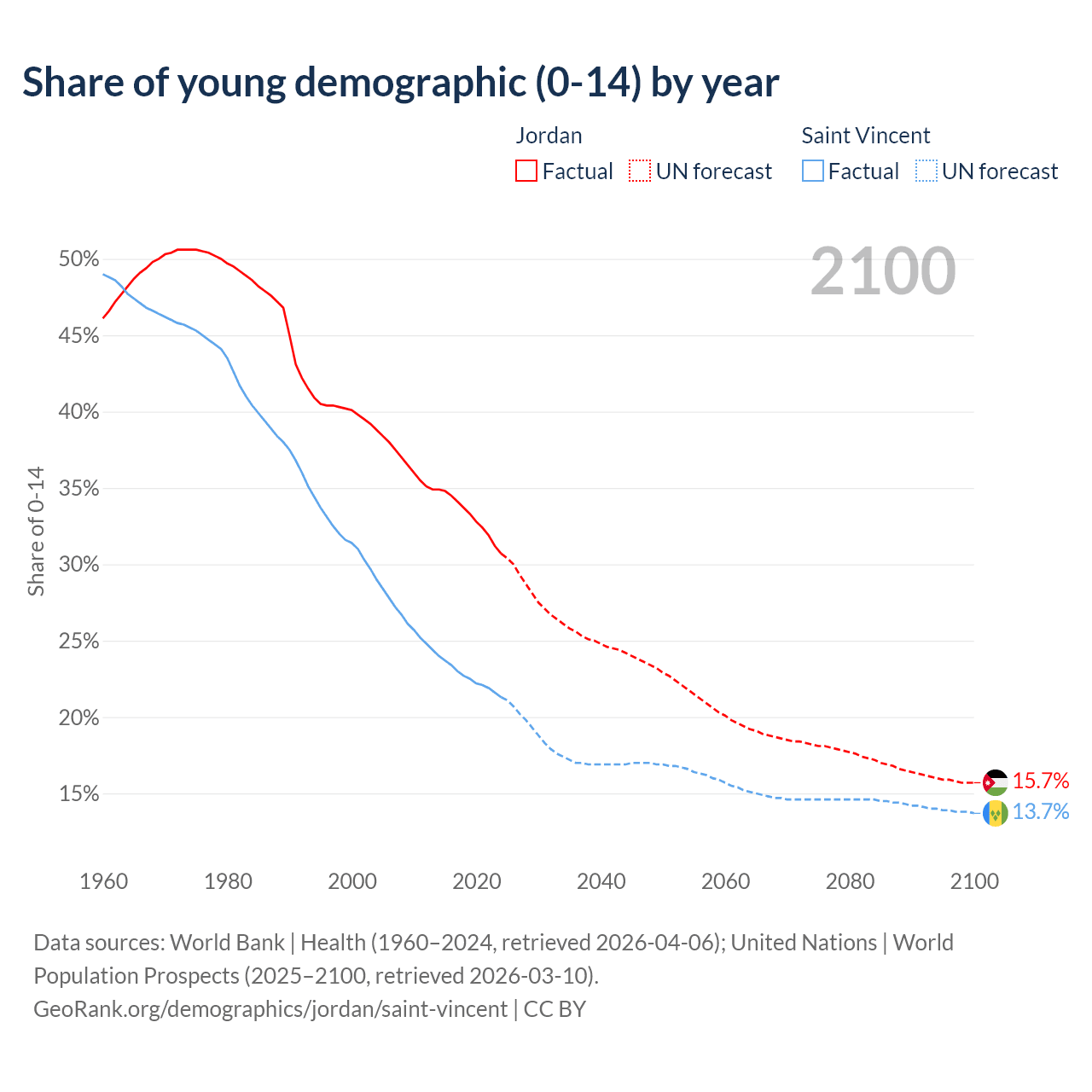 - The share of young demographic (0-15 years old) in Jordan is 30.7% vs 21.3% in Saint Vincent.