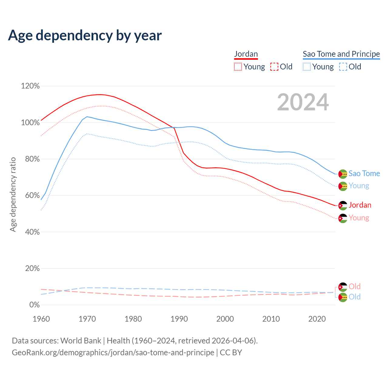 - Jordan is ranked 131/196 by median age (oldest to youngest) vs 163/196 for Sao Tome and Principe.