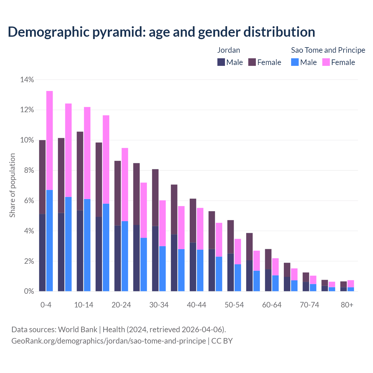 - The share of young demographic (0-15 years old) in Jordan is 30.7% vs 37.8% in Sao Tome and Principe.