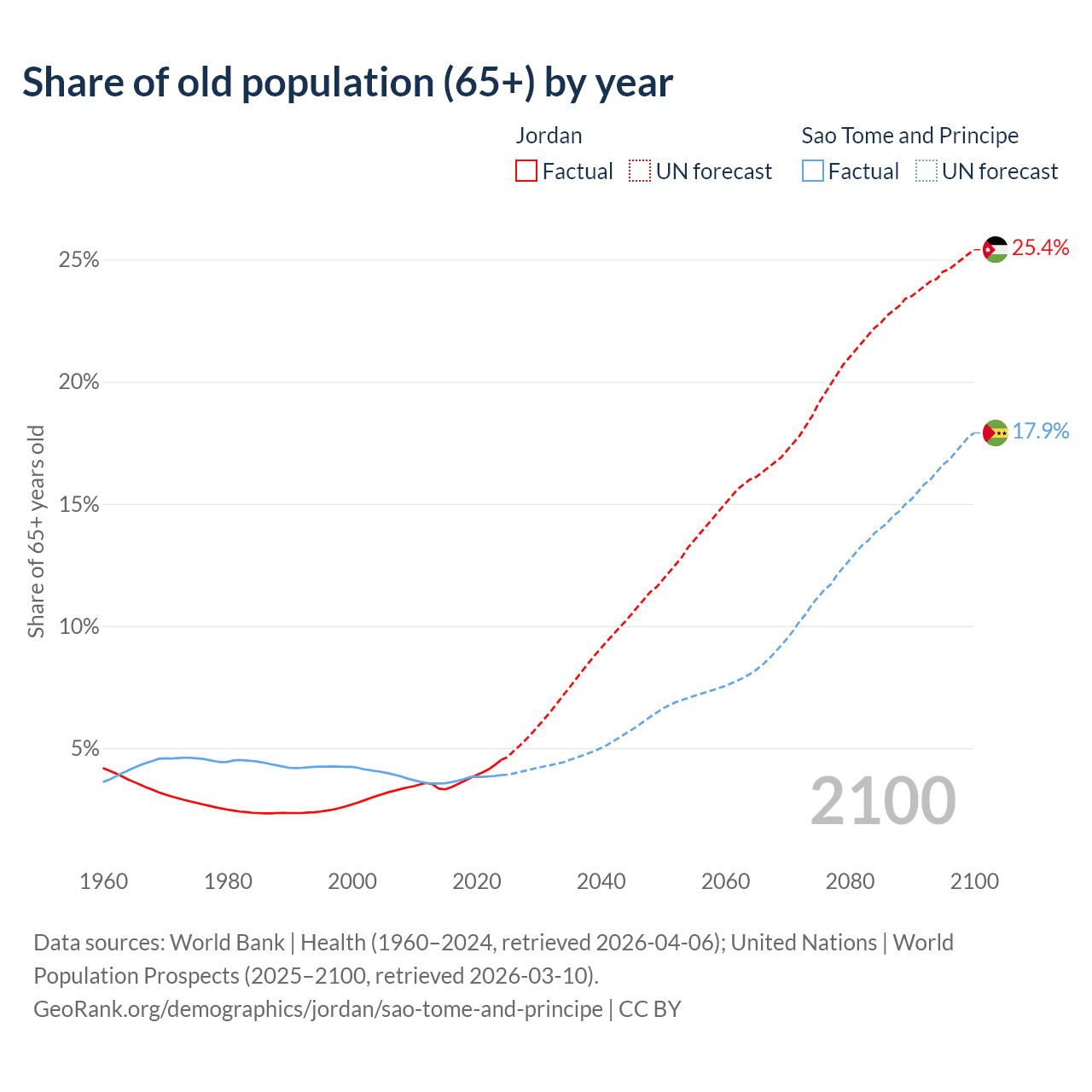 - The share of old-age demographic (65+) in Jordan is 4.52% vs 3.9% in Sao Tome and Principe.