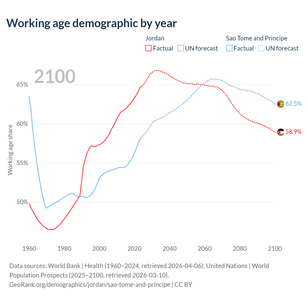 - Jordan has 7.49M working age adults (aged 15-64) vs 144K in Sao Tome and Principe.