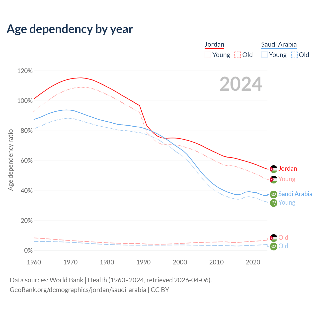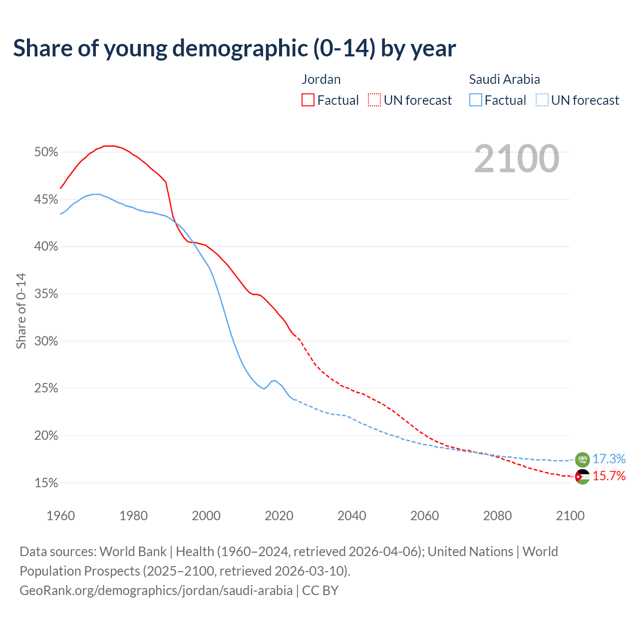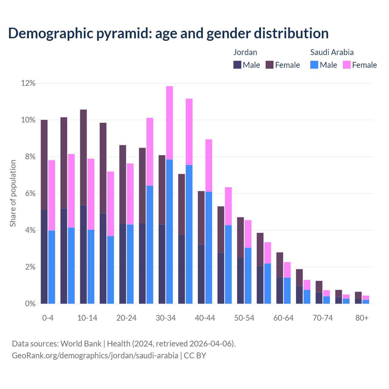 - Jordan is ranked 131/196 by median age (oldest to youngest) vs 98/196 for Saudi Arabia.