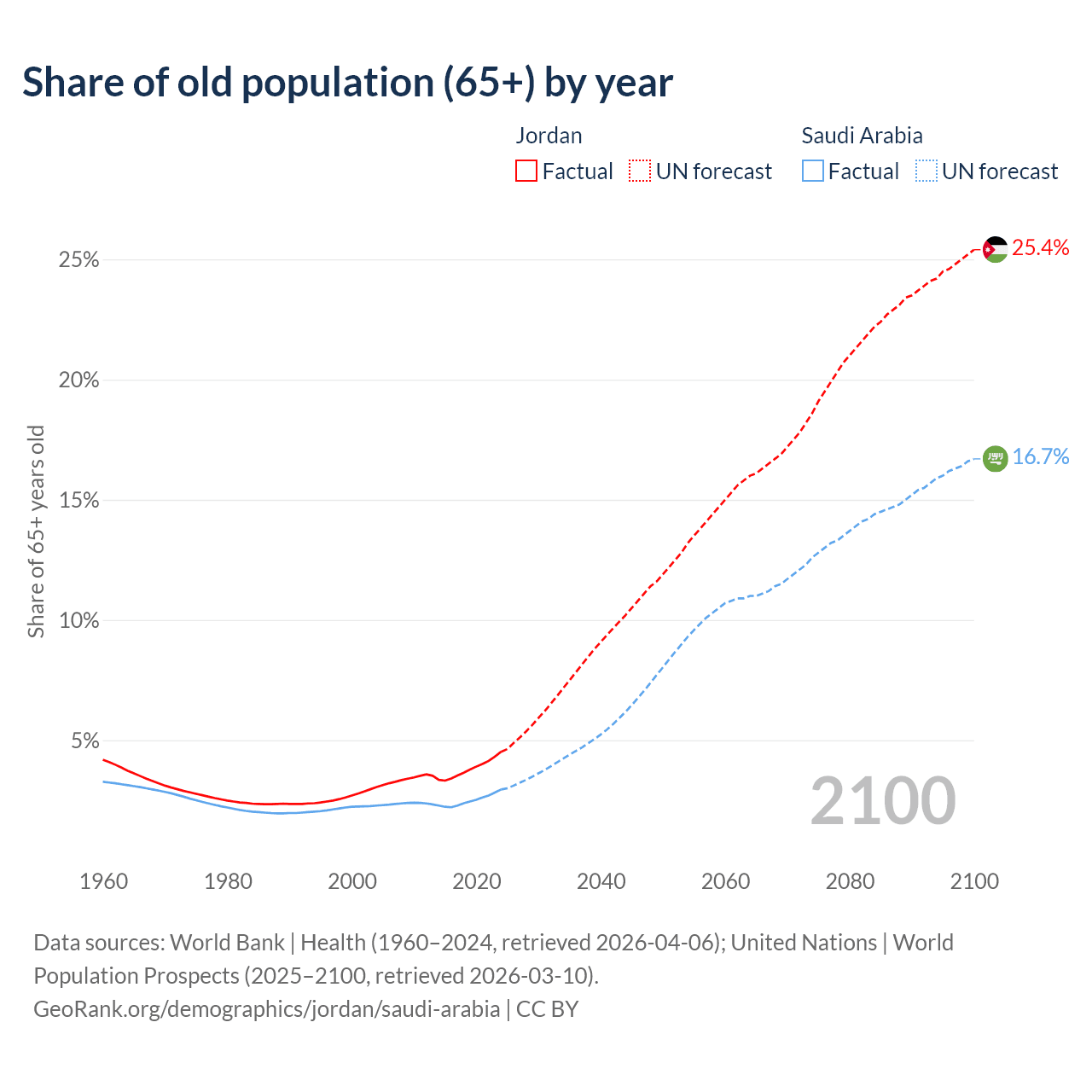 The share of older people aged 65 and over is 4.52% in Jordan and 2.95% in Saudi Arabia. Life expectancy in Jordan compared to Saudi Arabia .