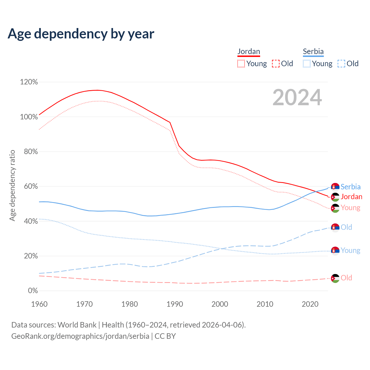 - The median age in Jordan is 25.5 years compared to 45.1 years in Serbia.
