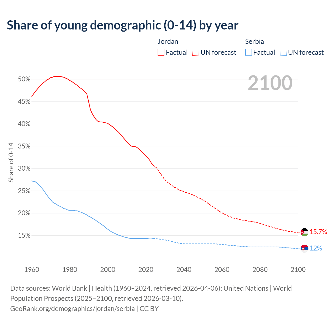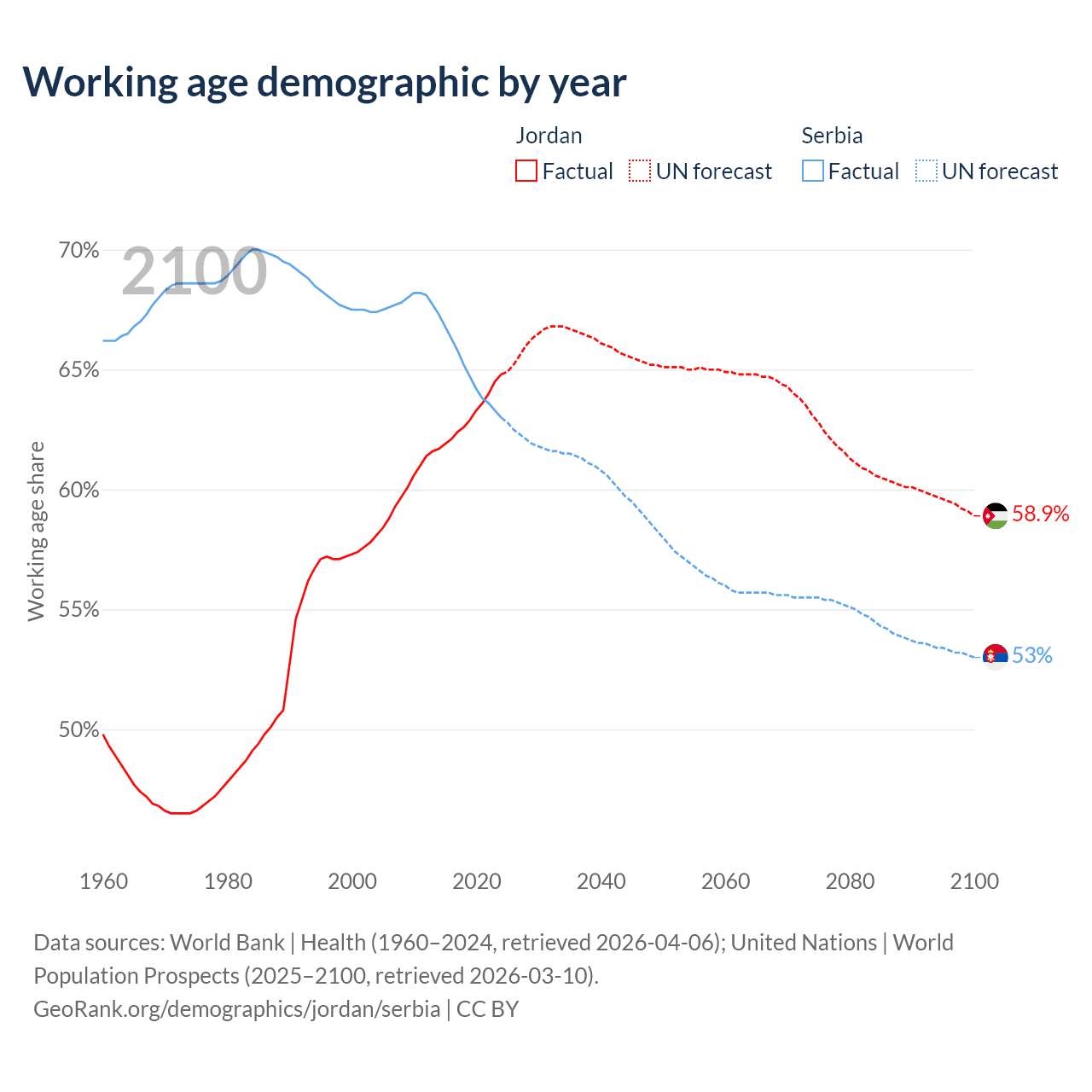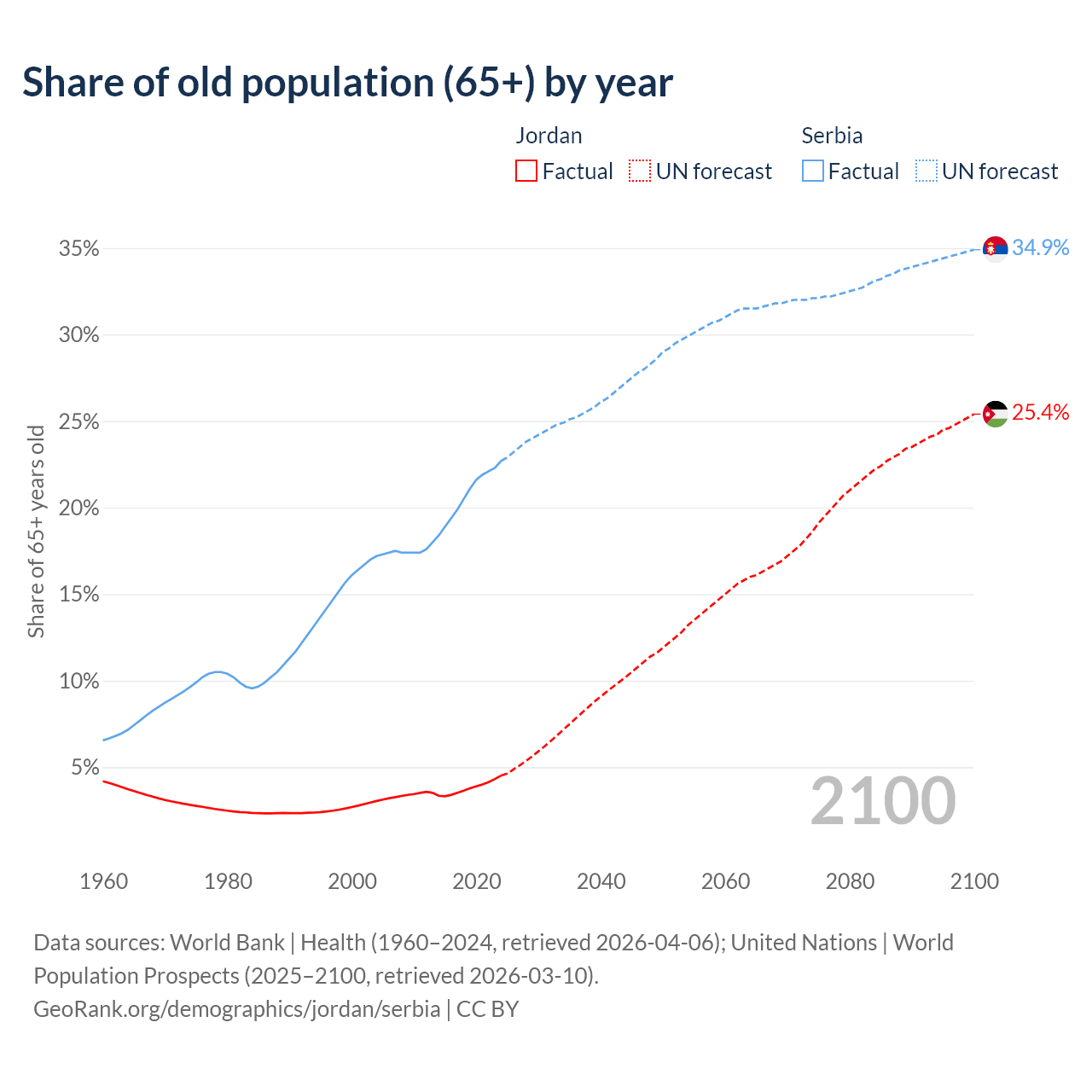 Median age Jordan vs Serbia, 1960-2100