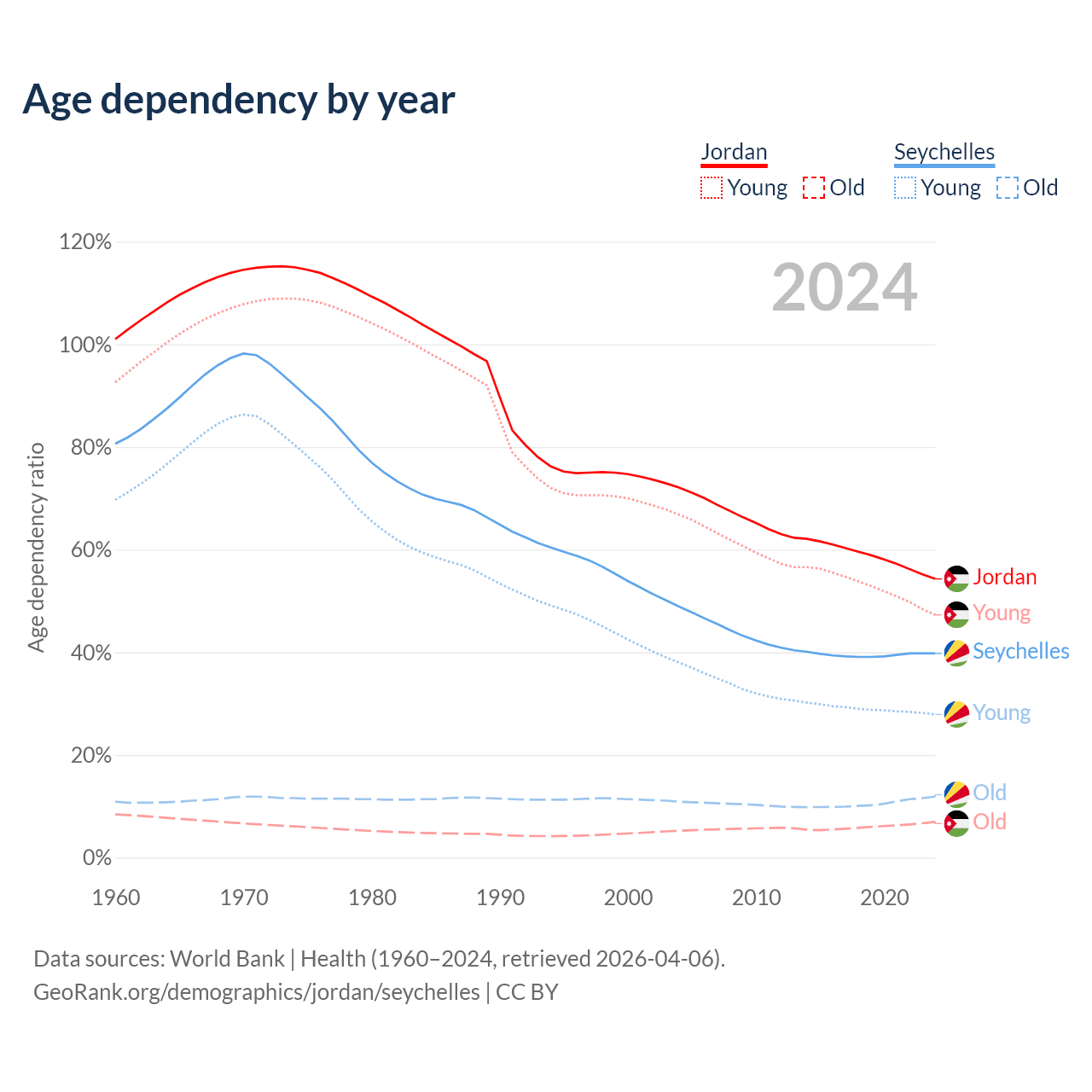 - Jordan is ranked 131/196 by median age (oldest to youngest) vs 76/196 for the Seychelles.