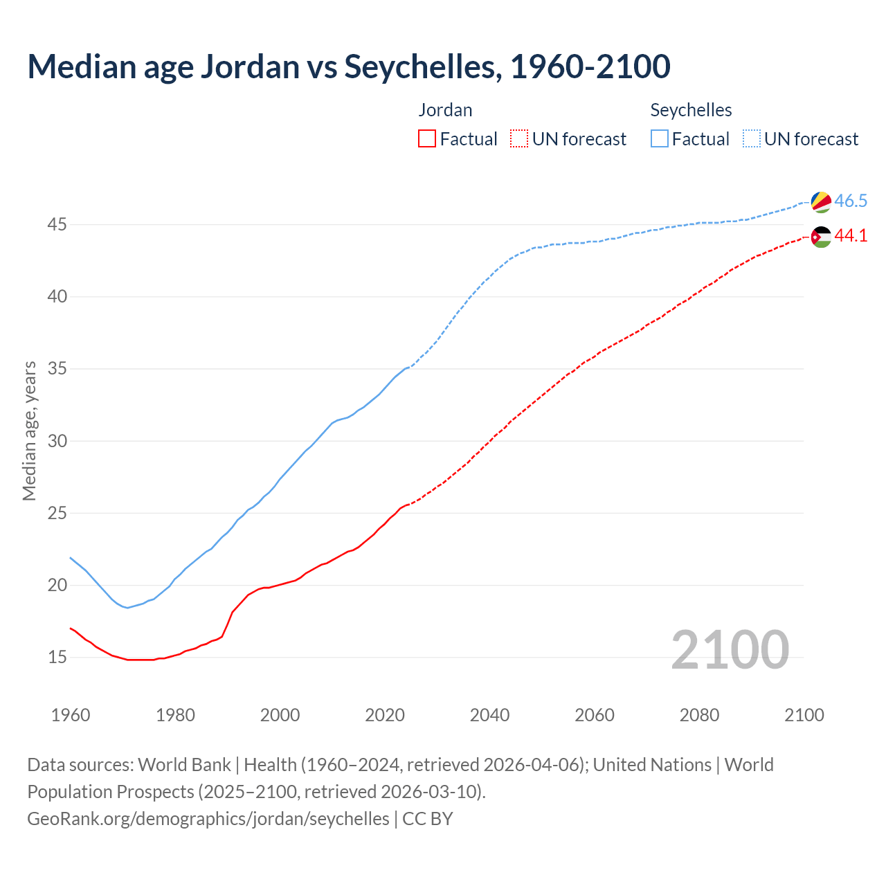 Median age Jordan vs Seychelles, 1960-2100