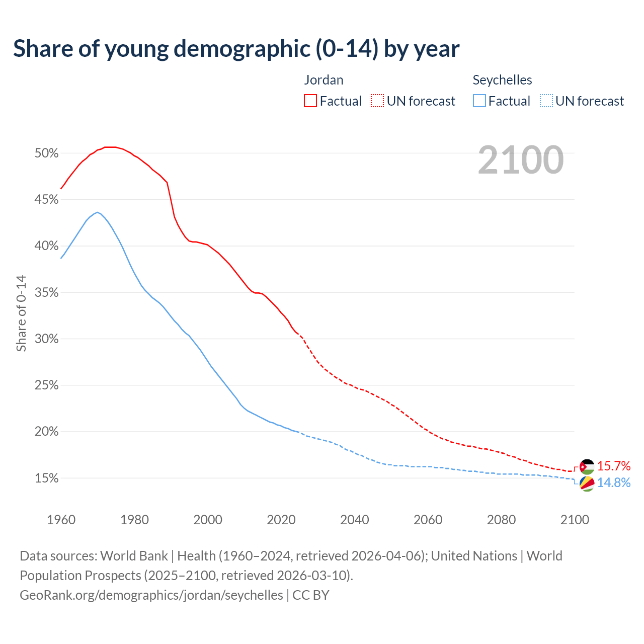 - The share of young demographic (0-15 years old) in Jordan is 30.7% vs 20% in the Seychelles.