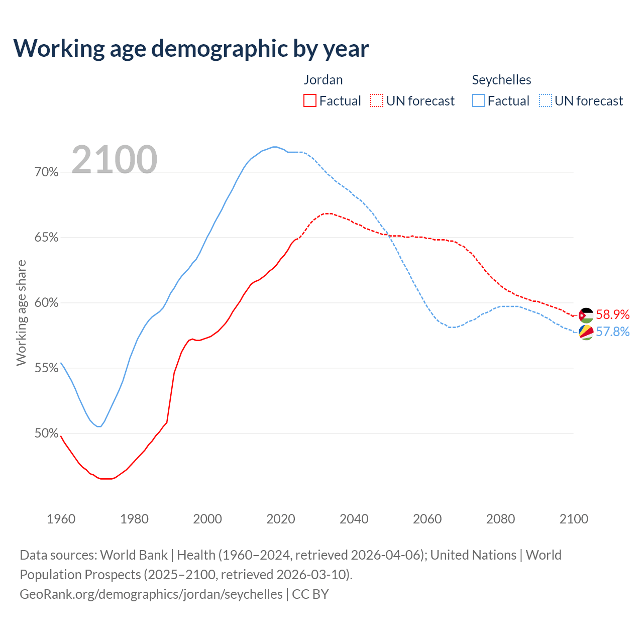 - Jordan has 7.49M working age adults (aged 15-64) vs 90.3K in the Seychelles.