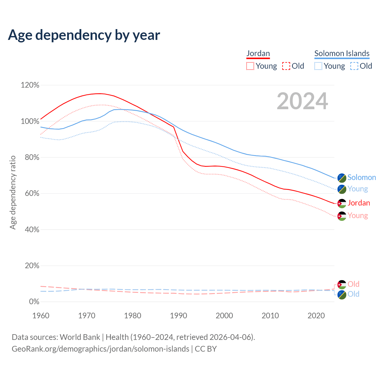 - Jordan is ranked 131/196 by median age (oldest to youngest) vs 153/196 for the Solomon Islands.