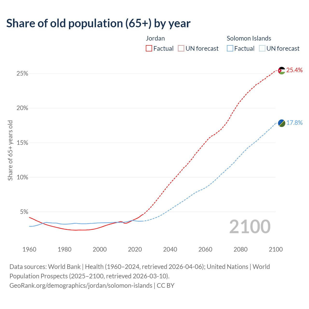 - The share of old-age demographic (65+) in Jordan is 4.52% vs 3.64% in the Solomon Islands.