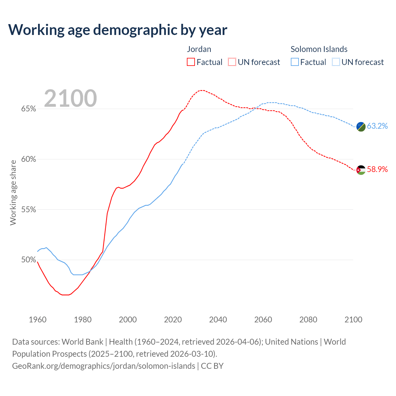 - Jordan has 7.49M working age adults (aged 15-64) vs 513K in the Solomon Islands.