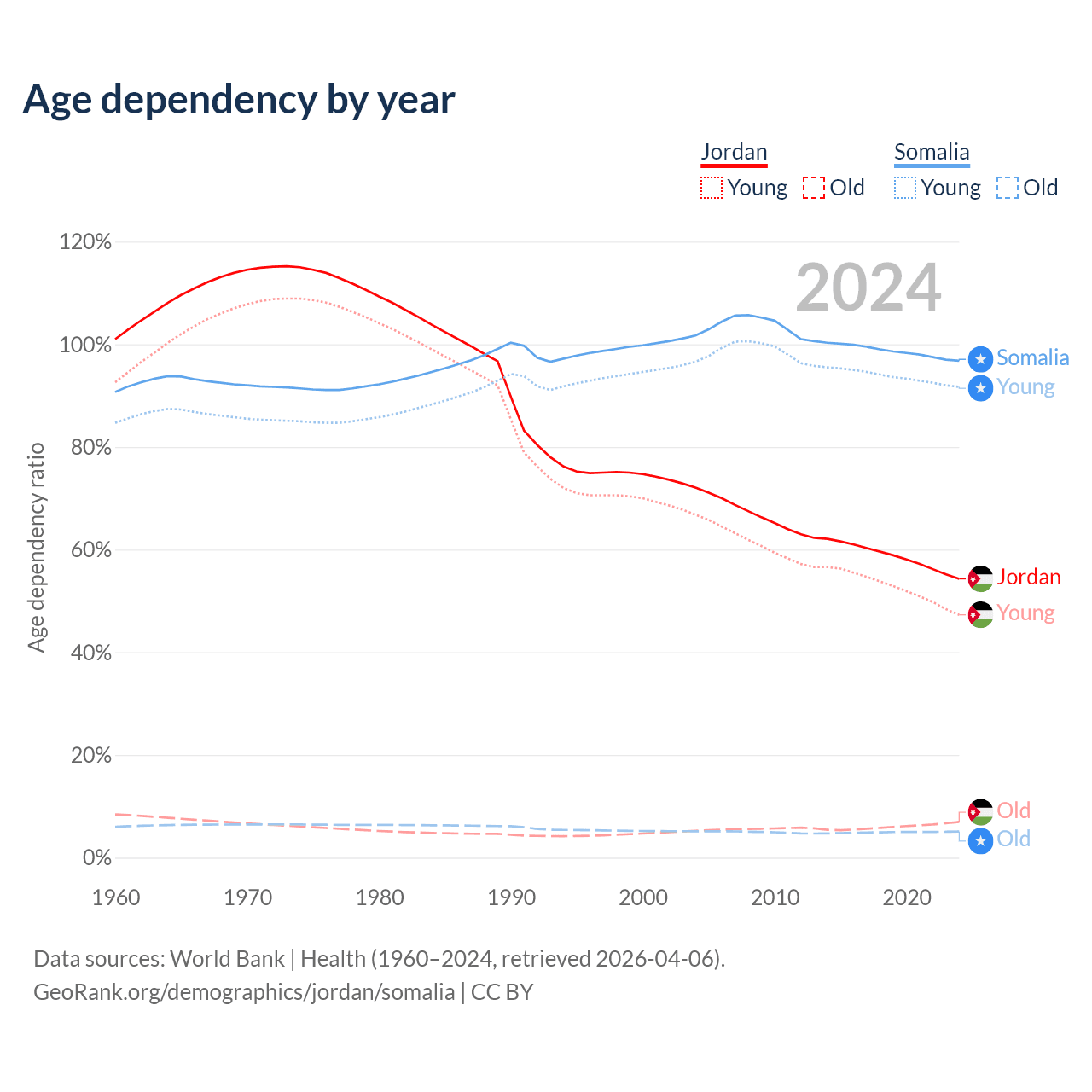 - Jordan is ranked 131/196 by median age (oldest to youngest) vs 194/196 for Somalia.