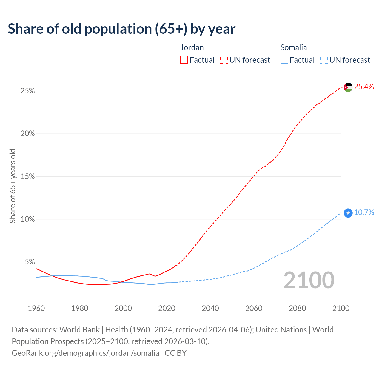 - The share of old-age demographic (65+) in Jordan is 4.52% vs 2.59% in Somalia.
