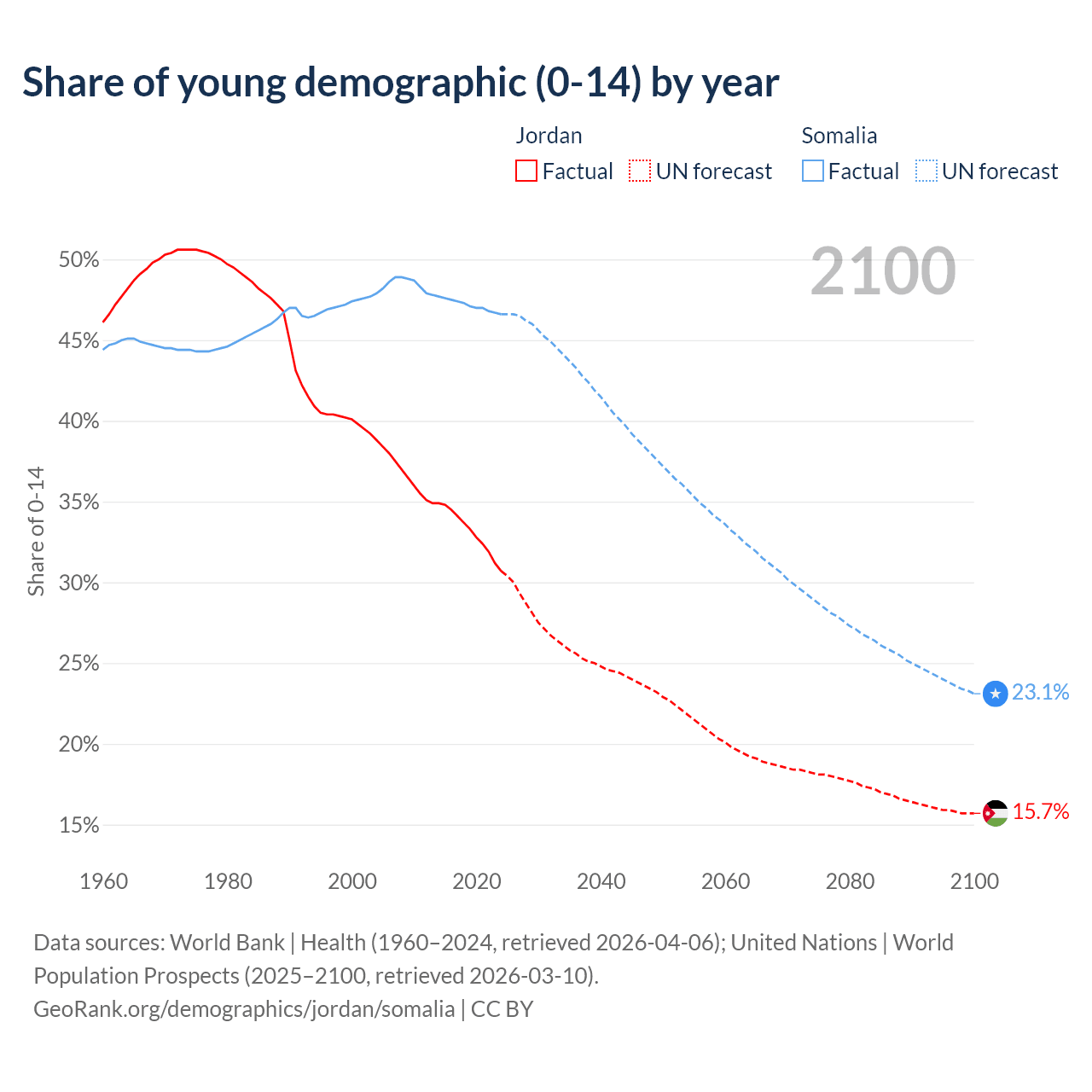 - The share of young demographic (0-15 years old) in Jordan is 30.7% vs 46.6% in Somalia.