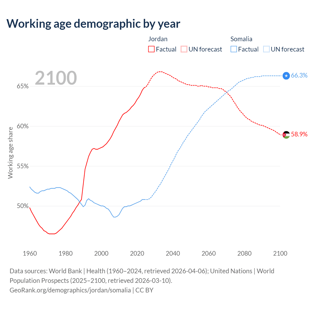 - Jordan has 7.49M working age adults (aged 15-64) vs 10.4M in Somalia.