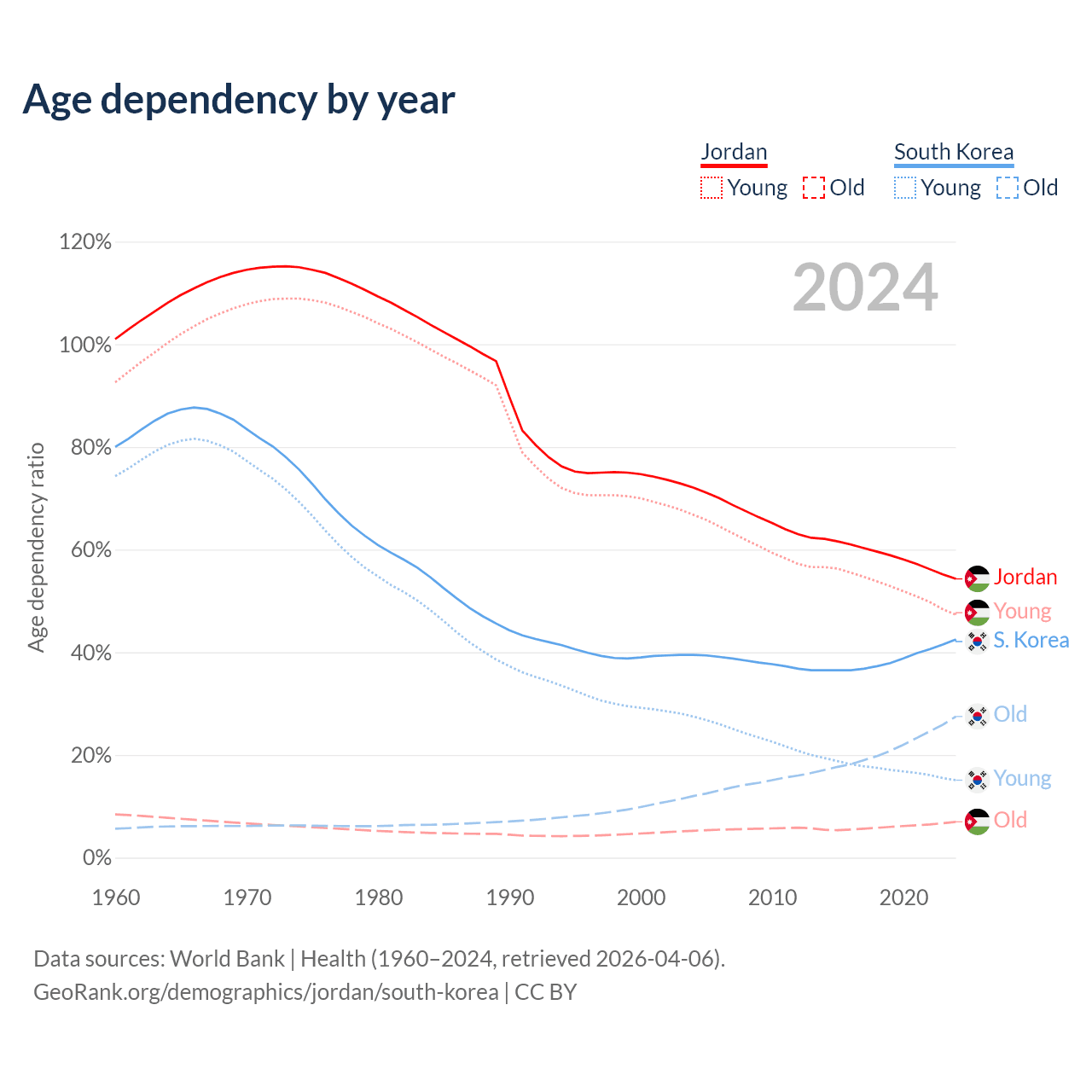 The share of older people aged 65 and over is 4.52% in Jordan and 19.3% in South Korea. Life expectancy in Jordan compared to South Korea .