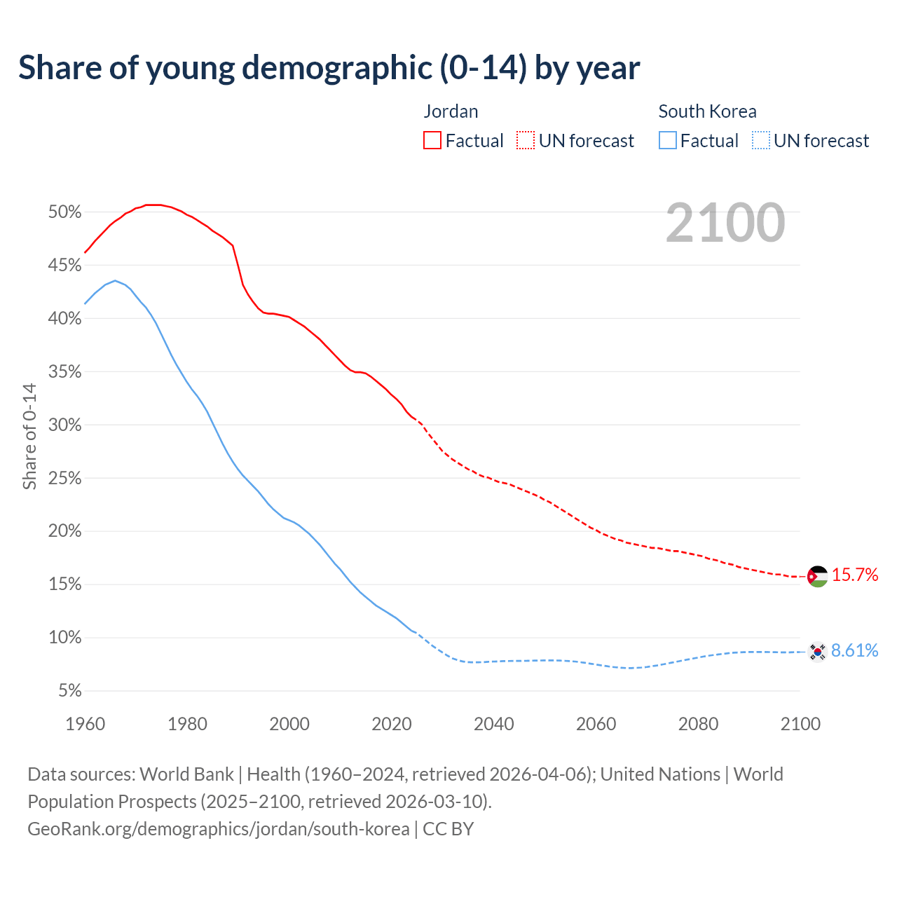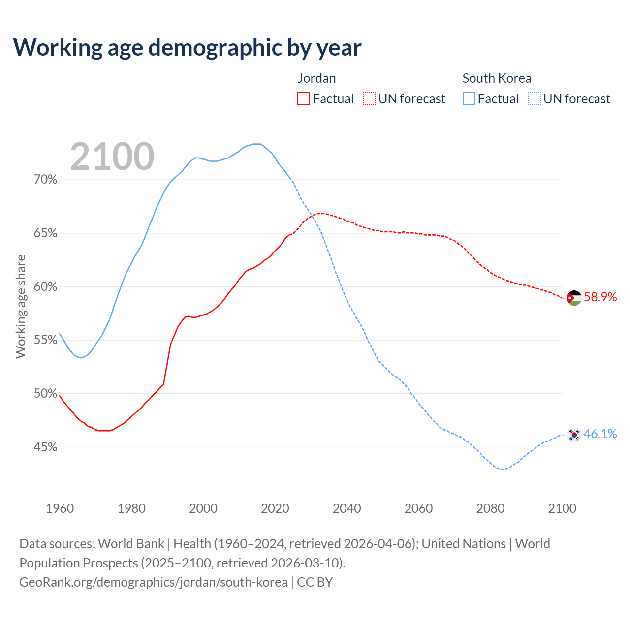 Median age Jordan vs South Korea, 1960-2100