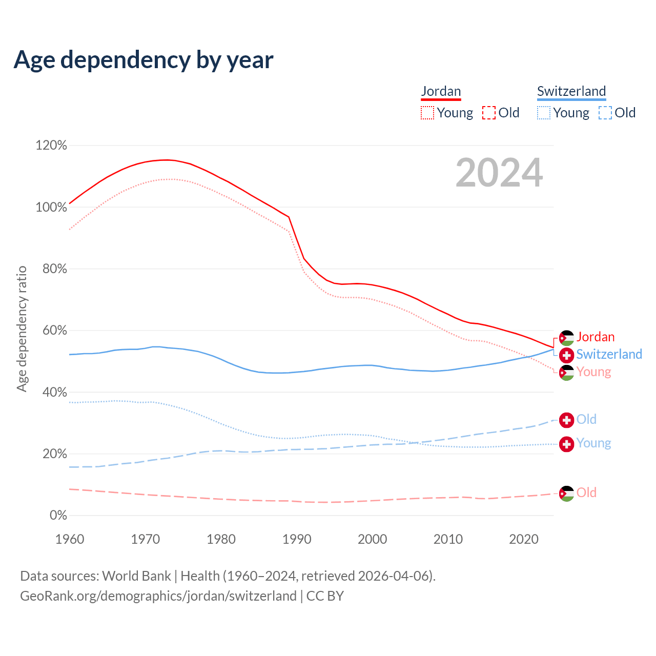 The share of older people aged 65 and over is 4.52% in Jordan and 20% in Switzerland. Life expectancy in Jordan compared to Switzerland .