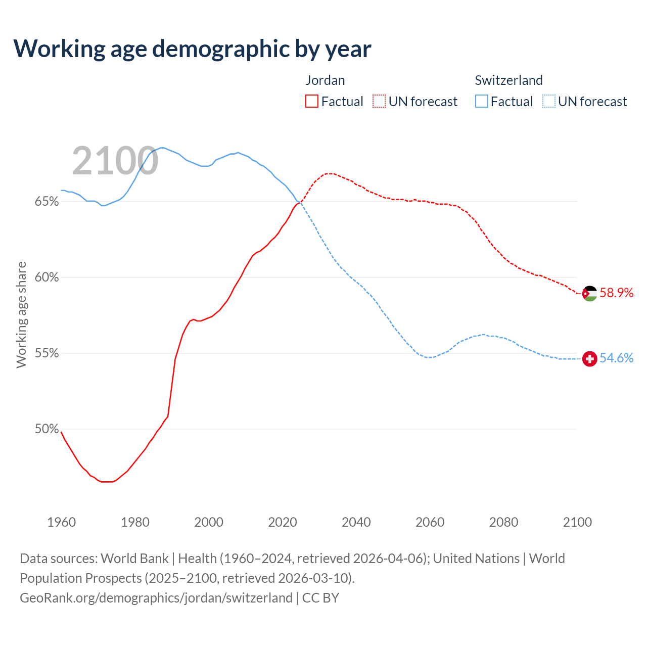 Median age Jordan vs Switzerland, 1960-2100